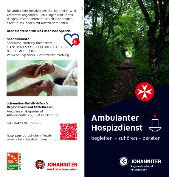 Ambulanter Hospizdienst MarburgDie ambulante Hospizarbeit der Johanniter unterstützt Schwerkranke und Sterbende in häuslicher Umgebung. Im Mittelpunkt stehen die Wünsche und Bedürfnisse der Betroffenen.