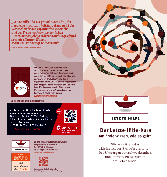 Ambulanter Hospizdienst MarburgDer Letzte Hilfe Kurs der Johanniter richtet sich an Angehörige, die Sterbende begleiten möchten. Der Kurs vermittelt Basisinfos und zeigt, wie dieser letzte Weg gestaltet werden kann.