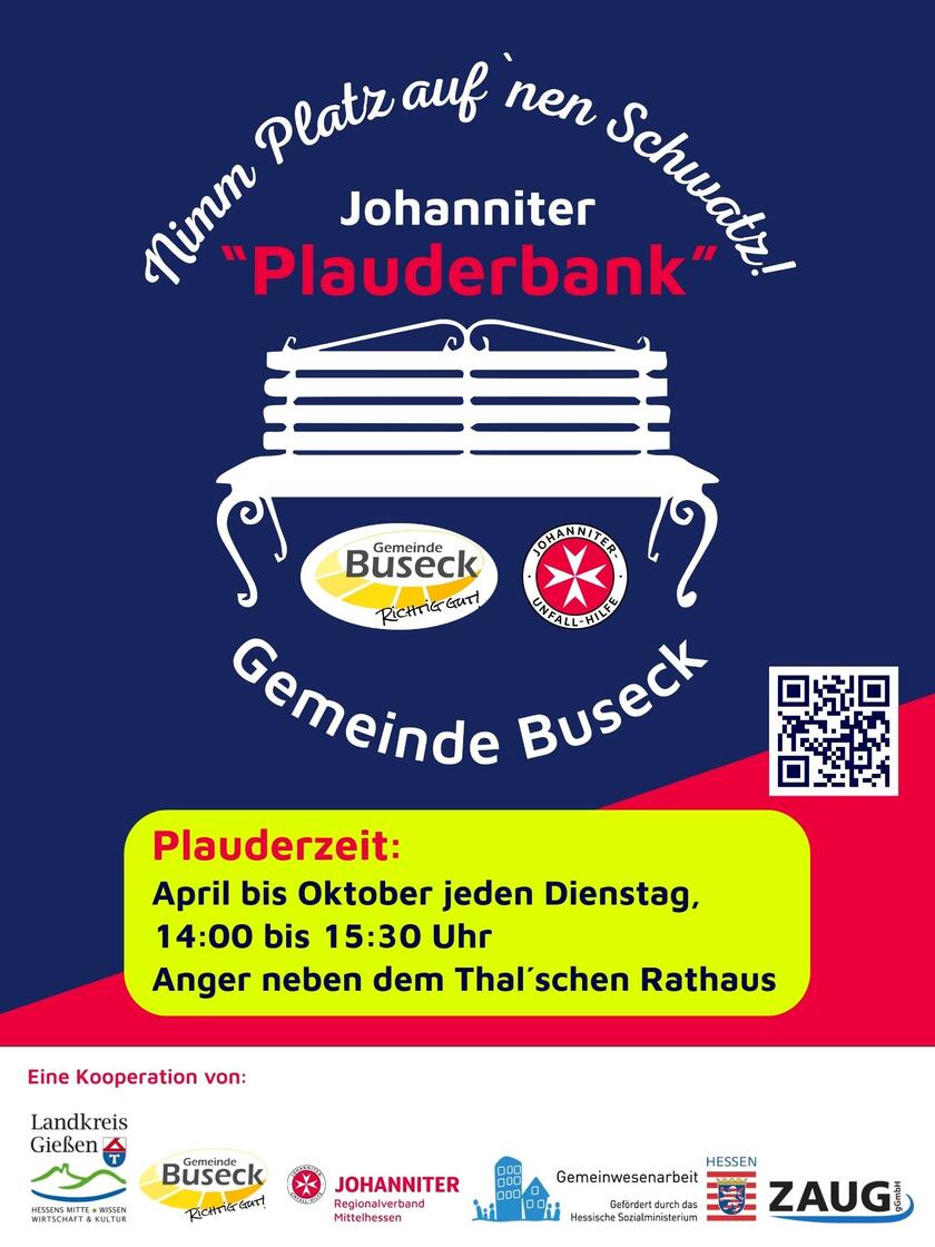 Am 22. Juli 2025 um 15:00 Uhr wurde in Großen-Buseck das Projekt „Plauderbank“ vorgestellt, das sich an einem Pilotprojekt der Johanniter in Marburg orientiert, wo sich die Bank als offenes Gesprächsangebot bereits seit April 2024 als geschätzter Plauder-Treffpunkt etabliert hat.