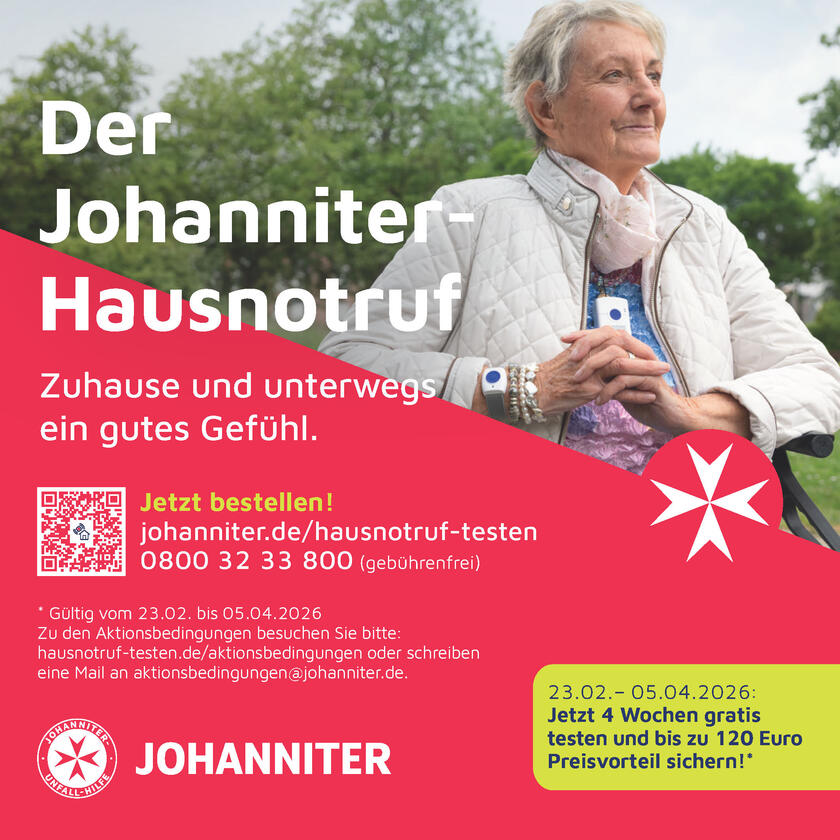 Die Johanniter bieten Ihnen im Aktionszeitraum (23.02.-05.04.2026) die Möglichkeit, den Johanniter-Hausnotruf für vier Wochen gratis zu testen. Sichern Sie sich jetzt bis zu 120€ Preisvorteil*!