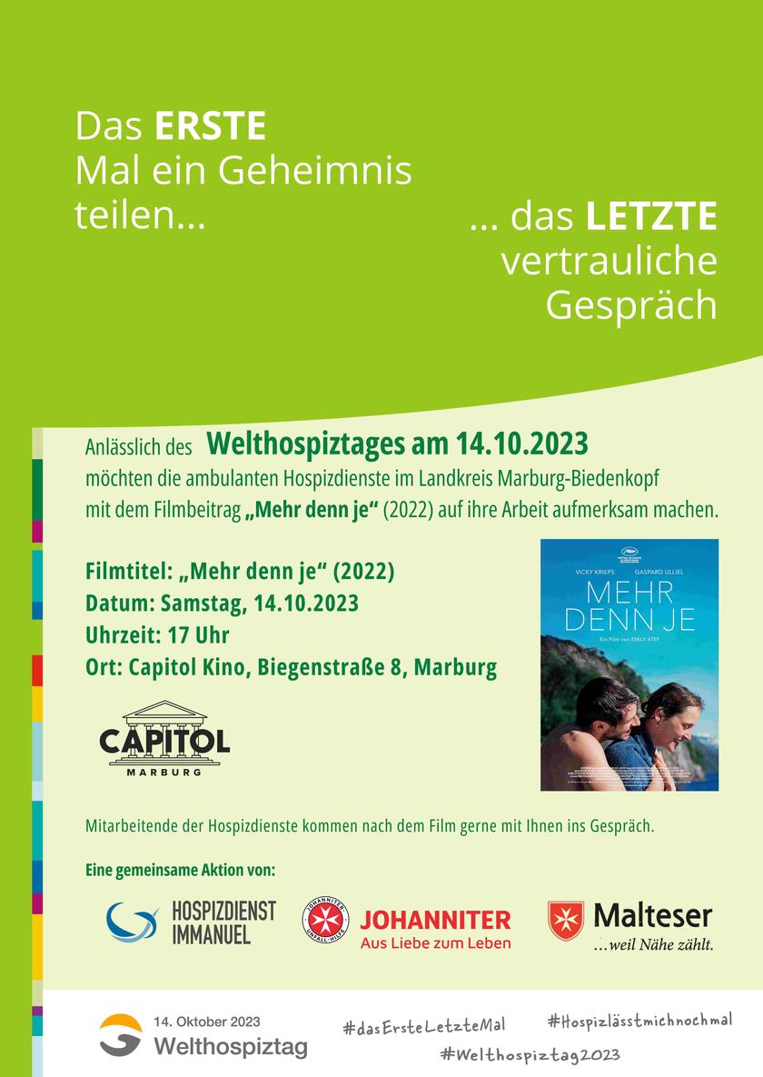 Am Samstag, den 14. Oktober 2023, ist Welthospiztag. Diesen Tag möchten die drei ambulanten Hospizdienste im Landkreis Marburg-Biedenkopf in Kooperation mit dem Capitol Kino dazu nutzen, um auf ihre Arbeit aufmerksam zu machen: