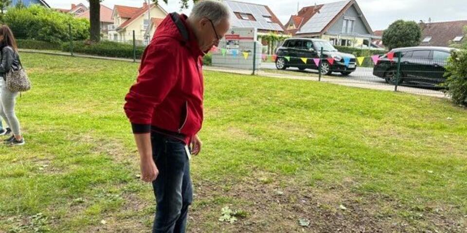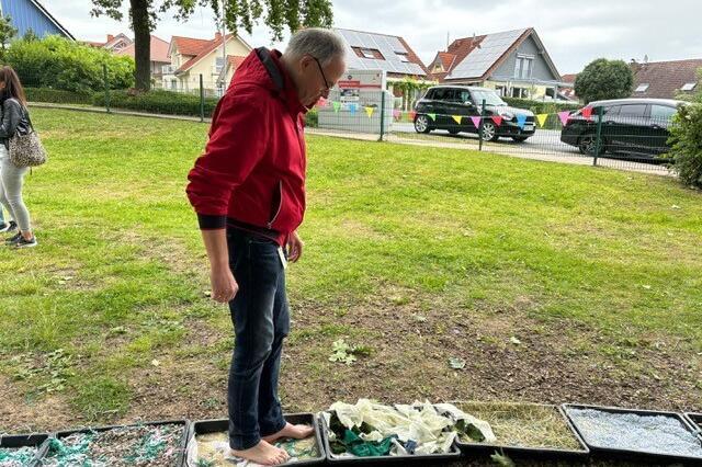 Beim Sommerfest wurden den Eltern dann die „Erkenntnisse“ in bunten Plakaten mit vielen Fotos der letzten Wochen präsentiert. Es wurden verschiedene Mitmachstationen angeboten, darunter eine Forscherecke, Wasserexperimente (Schwimmen und Sinken), man konnte selbst Sensorikflaschen mit bunter Flüssigkeit und Schwebeteilchen befüllen oder einen Barfußpfad mit verschiedenen Untergründen entlangschreiten. Eine interessante Erfahrung, der sich auch Regionalvorstand Marco Schulte-Lünzum gerne mal baren Fußes stellte. Natürlich durfte auch das gemeinsam einstudierte „Ritterlied“ nicht fehlen – schon jetzt eine feste Tradition zur Eröffnung des Nachmittags, dem auch Bürgermeister Michael Ranft einen Besuch abstattete.