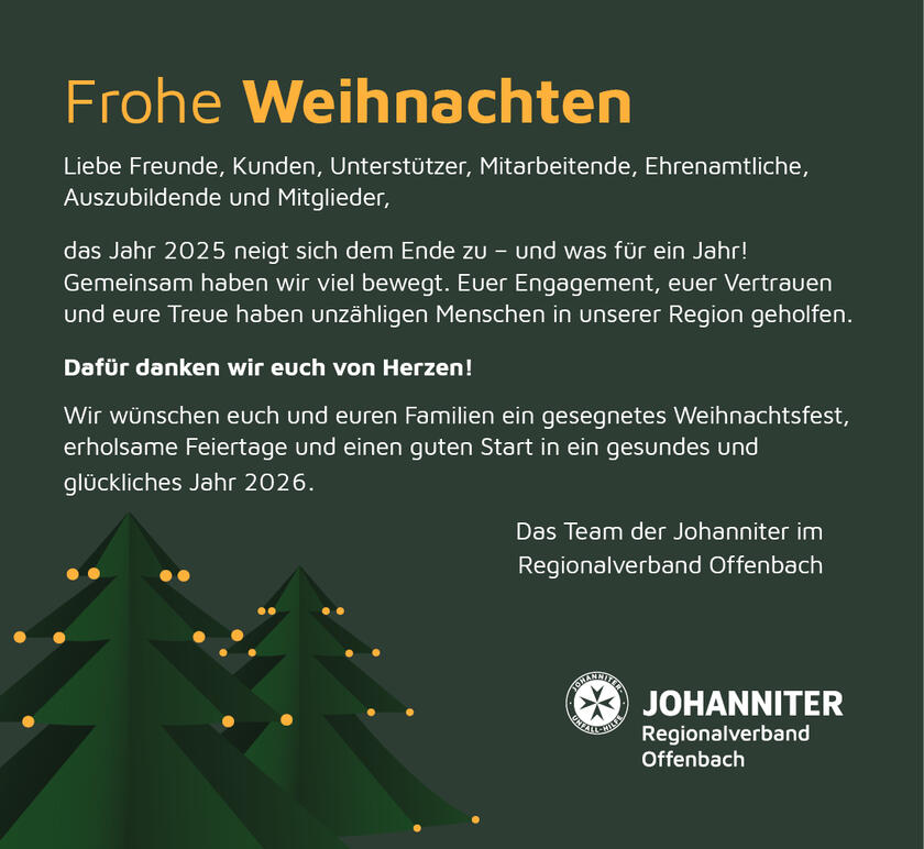 Für die Menschen im Kreis Offenbach geben unsere engagierten Johanniterinnen und Johanniter jeden Tag ihr Bestes. Mit Ihrer freien Spende machen Sie es möglich, dass wir jederzeit einsatzbereit bleiben und schnellstmöglich helfen können.