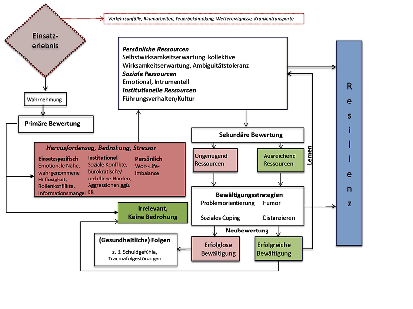Die Freie Universität Berlin befasste sich mit der Fragestellung, welche Belastungen Einsatzkräfte in Deutschland erleben und wie man sie unterstützen und somit ihre psychosoziale Resilienz stärken kann. Dazu wurden zunächst 25 Einsatzkräfte und Experten interviewt und anschließend eine Online-Befragung durchgeführt, an der 774 Einsatzkräfte teilnahmen. Die Ergebnisse zeigen die bedeutsamen Belastungen sowie psychosoziale Ressourcen und Copingstrategien, die bei der Bewältigung helfen und die Resilienz stärken. Diese wurden in einem Gesamtmodell dargestellt. Identifizierte unterstützende Maßnahmen wurden im Rahmen von Sensibilisierungs- und Schulungsmaßnahmen, wie den Stresstests und dem Einsatzhandbuch umgesetzt umgesetzt.
