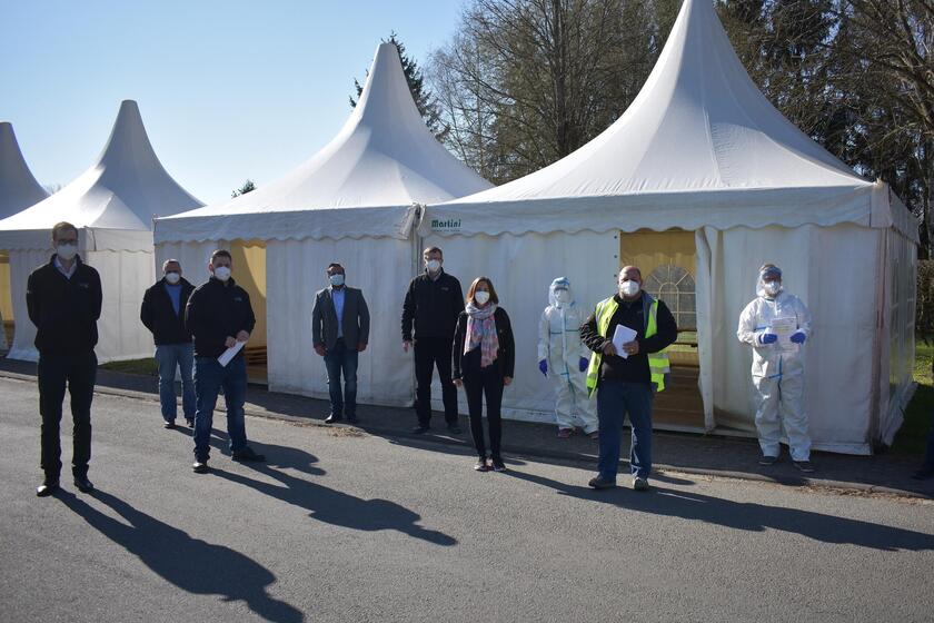 Mit einer neuen kosten- und terminfreien Corona-Schnelltesteinrichtung in Mandern schließen die Johanniter eine Versorgungslücke im Kreis Trier-Saarburg: Unterstützt von der ortsansässigen Firma Bilstein in Zusammenarbeit mit der Verbandsgemeinde Saarburg-Kell testen die Johanniter jetzt zweimal wöchentlich in Mandern-Niederkell jeden, der spontan getestet werden möchte. Die zwei großen Zelte vor dem Betriebsgelände des Unternehmens Bilstein in Mandern, Niederkell 25, stehen ab sofort mittwochs und freitags von 9:30 bis 12:30 Uhr und von 13 bis 15 Uhr für Testwillige offen. „Wir könnten hier bis zu 300 Tests pro Tag realisieren“, lädt Johanniter Regionalvorstand Daniel Bialas die Menschen ein, vorbeizukommen. „Wir haben für ausreichend Parkraum direkt bei der Teststation gesorgt“, verspricht Bilstein-Werkleiter Thomas Kuhlmann. Auch Manderns Ortsbürgermeister Tim Kohley ist froh: „Nun muss niemand mehr reservieren und in weiter entfernte Orte fahren.“