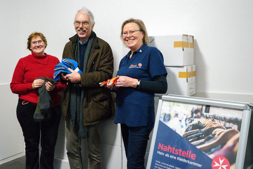 Der Lions Club Langenhagen hat heute 1.000 Paar Socken an die Langenhagener Kleiderkammer "Nahtstelle" gespendet. Ulrich Seiboth vom Service-Club überreichte die Spende an Kleiderkammerkoordinatorin Jennifer Rihm und die Ehrenamtliche Charlotte Schöneck. Die Socken des Herstellers Falk gibt es in verschiedenen Größen sowohl für Kinder als auch Erwachsene und sind jeweils geeignet für kalte und wärmere Wetterbedingen.