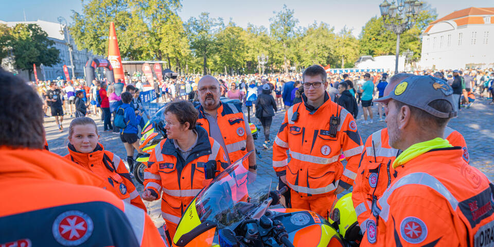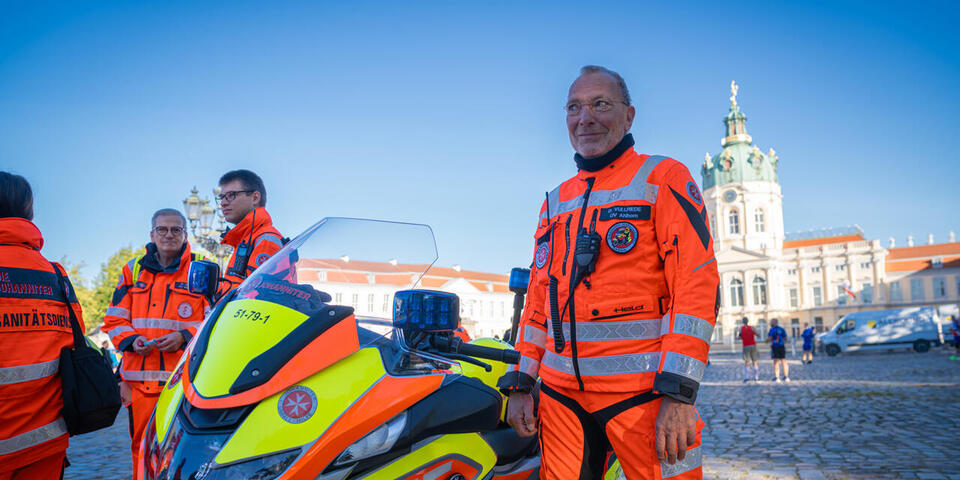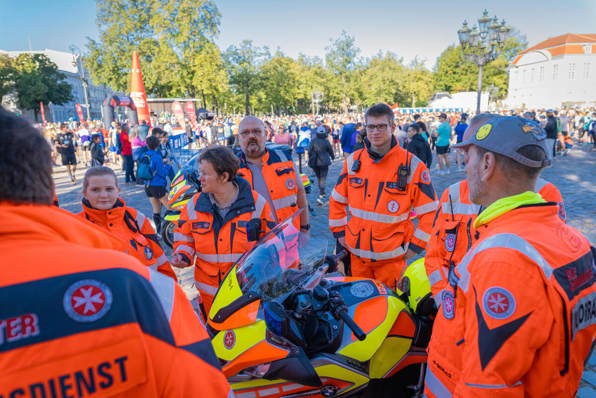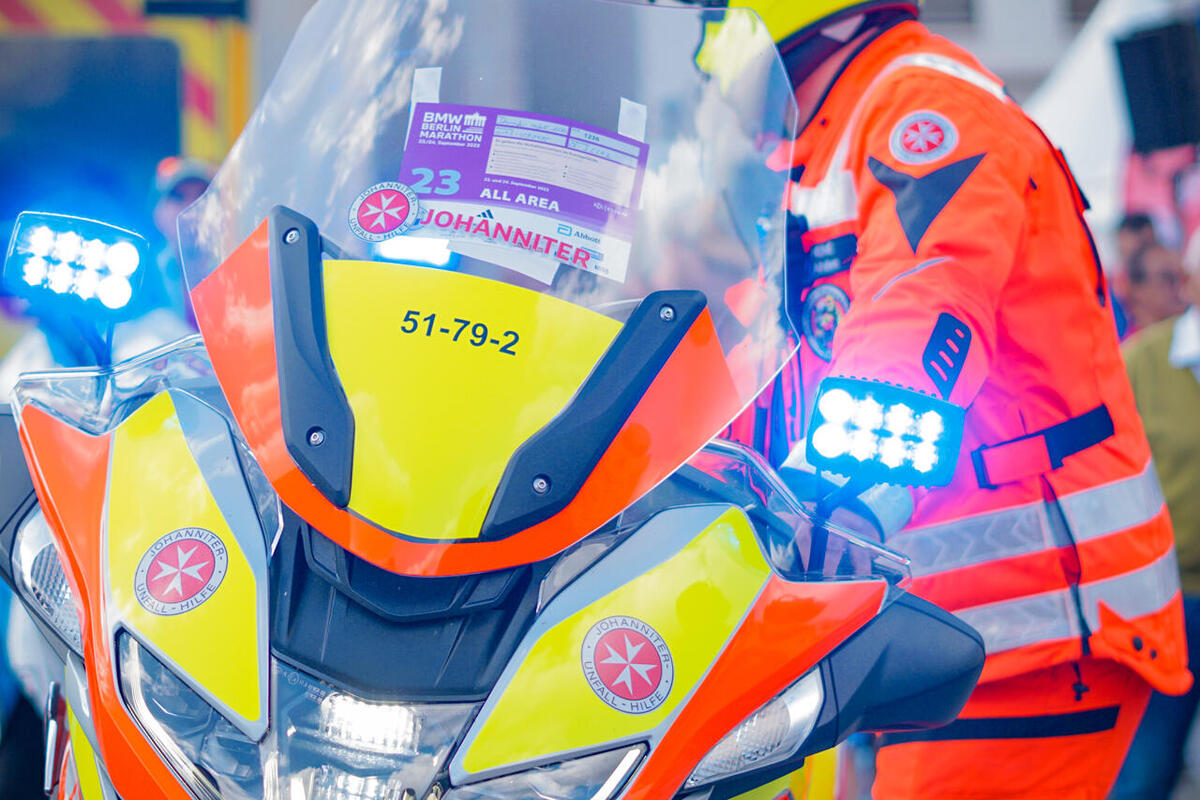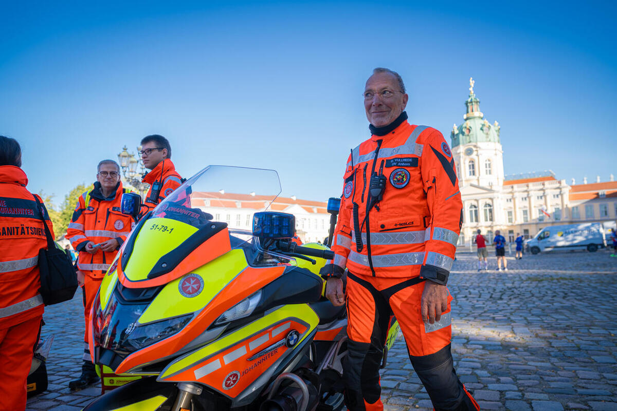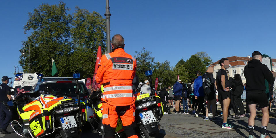 Zum 15. Mal stellten die Johanniter des Regionalverbands Berlin den Sanitätsdienst beim Berlin Marathon. Aufgrund der Größe dieser Veranstaltung forderten die Berliner Johanniter Unterstützung aus dem gesamten Bundesgebiet an. Einem Aufruf an alle Johanniter-Motorradstaffeln folgte auch die Staffel des Ortsverbands Ahlhorn und entsendete alle verfügbaren Kräder in die Bundeshauptstadt. Deutschlands größtes Sportevent umfasst einen Sechs-Kilometer-Lauf mit 9000 Läuferinnen und Läufern aus 120 Nationen, einen Skaterlauf sowie einen 42,195 Kilometer langen Marathon mit über 47.000 Läuferinnen und Läufern durch Berlin. Rund eine Million Zuschauerinnen und Zuschauer säumten die Strecke. „Unsere Motorräder wurden unter anderem als Lotsen an verschiedenen Punkten rund um die Straße des 17. Juni und dem Berliner Tiergarten eingesetzt und fungierten als ‚Wellenbrecher‘ und Navigator für anfahrende Rettungsfahrzeuge“, erzählt Günther Behrendt, Leiter der Ahlhorner Motorradstaffel, der zusammen mit Christian Freye, Steve Hense und Dieter Vullriede in die Bundeshauptstadt gereist war. Die Lotsen-Kräder übernahmen am jeweiligen Lotsenpunkt einfahrende Rettungsfahrzeuge und führten diese gezielt zur jeweiligen Unfallhilfsstelle (UHS) auf dem sehr großen und unübersichtlichen Veranstaltungsgelände. So entfiel für die nachgeforderten Rettungsmittel das lange Suchen nach der zugewiesenen UHS. „Dadurch war eine schnelle Übergabe an den Regelrettungsdienst und der anschließende Transport ins jeweilige Krankenhaus zeitnah sichergestellt“, sagt Behrendt.