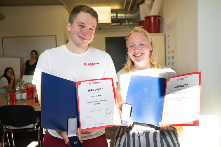 Für ihre Pionierarbeit in der Johanniter-Jugend in Langenhagen wurden Julius Richter und Stephanie Rihm in der letzten Gruppenstunde vor den Sommerferien gewürdigt.