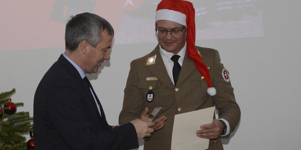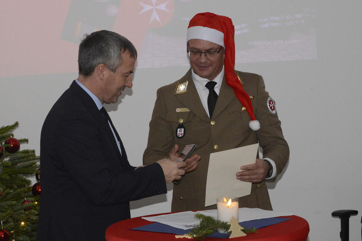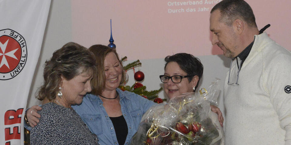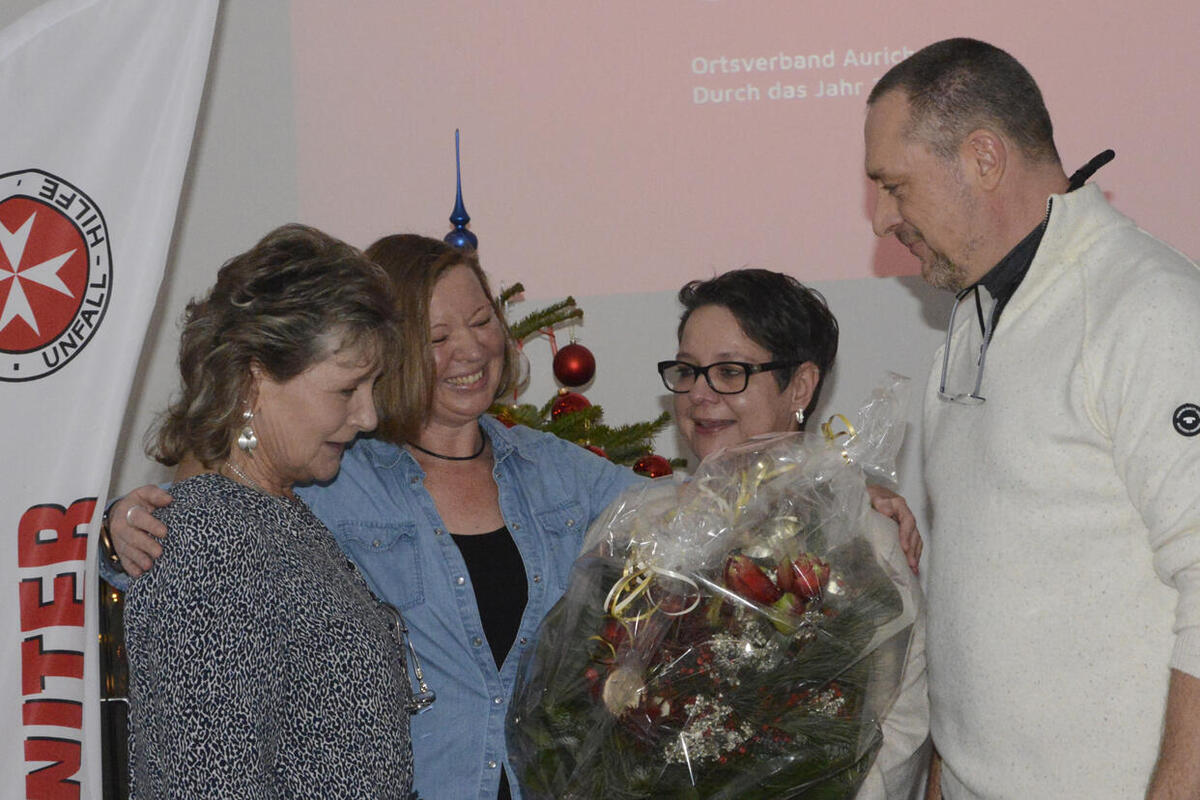 Mit kleinen Aufmerksamkeiten wie einem gebundenen Notizbuch „für Wünsche, Ideen und Erlebnisse“ und einem Schokoladen-Weihnachtsmann bedankten sich Ortsbeauftragter Sebastian Schulze und Dienststellenleiterin Helene Frieden während der Weihnachtsfeier des Ortsverbands Aurich der Johanniter-Unfall-Hilfe bei ihren ehrenamtlichen Helfenden und hauptamtlichen Mitarbeitenden für ihr Engagement im zu Ende gehenden Jahr. „Ohne euren außergewöhnlichen Einsatz wäre als das, was wir 2024 wieder geleistet haben, nicht möglich gewesen“, sagte Helene Frieden. Anschließend gab es noch eine große Aufmerksamkeit – für einen Einsatz, der bereits 2021 erbracht wurde. Johann Saathoff (SPD), Mitglied des Bundestages (MdB) und Parlamentarischer Staatssekretär im Bundesinnenministerium, überreichte im Auftrag seiner Chefin, Bundesinnenministerin Nancy Faeser, die Ehrenmedaille Fluthilfe 2021. Damit zeichnet die Bundesrepublik Deutschland Corinna und Axel Keßler, Hanna Jürgens, Nadine Greß, Lena Rabenstein und Sebastian Schulze für ihre besonderen Verdienste nach der Flutkatastrophe im Ahrtal aus. Alle sechs gehörten zum ersten Kontingent aus Weser-Ems, das vom Land Niedersachsen als Unterstützung der Kräfte vor Ort als Amtshilfe entsandt worden war. „Sie haben das Wohl und die Unversehrtheit von Anderen über Ihr eigenes gestellt“, sagte Saathoff bei der Überreichung der Urkunden. „Dafür gilt unser großer Dank.“