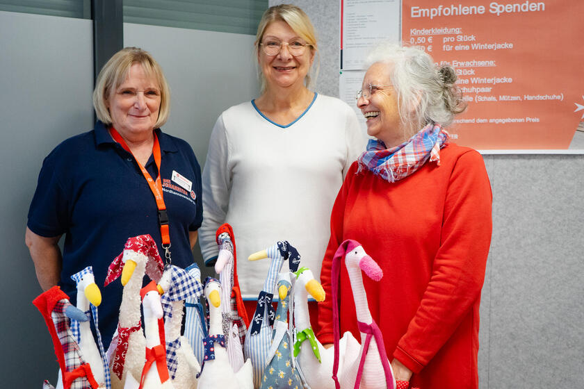 Ein Surren liegt in der Luft, gefolgt von dem gleichmäßigen Rattern der Nähmaschinen. In der Kleiderkammer „Nahtstelle“ sitzen Christa Harms (72), Ilona Müller (69) und Johanna Holze (69), umgeben von Nähnadeln, einer Kiste mit Schneidewerkzeugen und Reststoffen. Dieses Trio bildet das Nähteam der Johanniter in Langenhagen, das unbrauchbare Stoffe in kuschelige Gänse und Enten für den Rettungsdienst upcycelt.