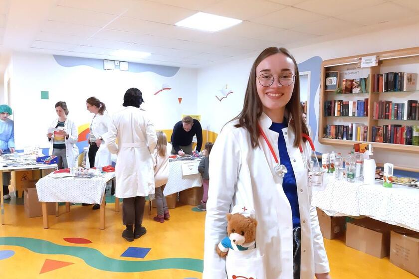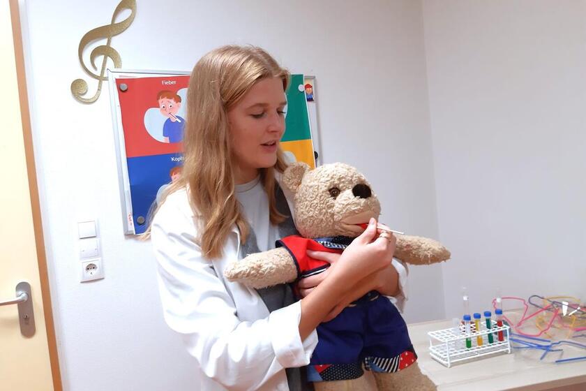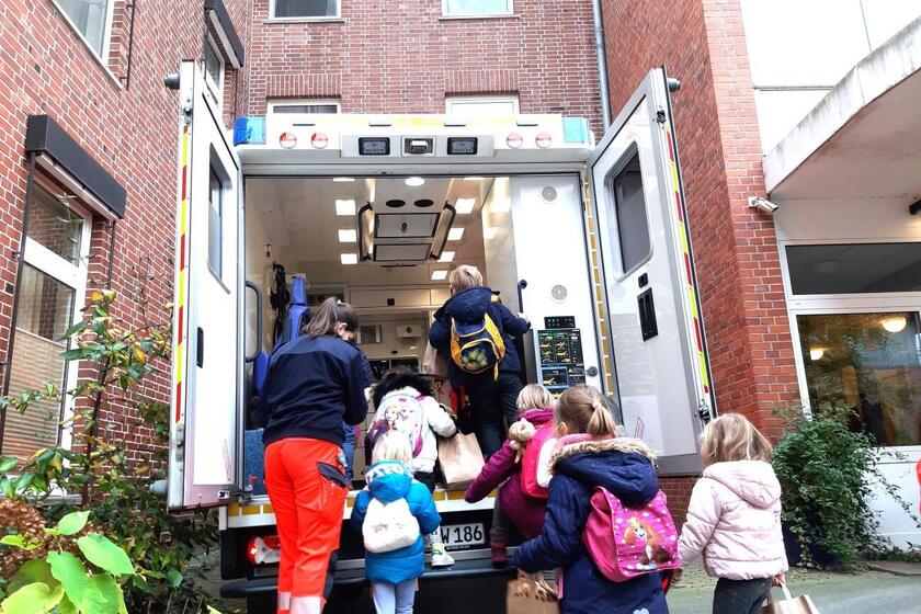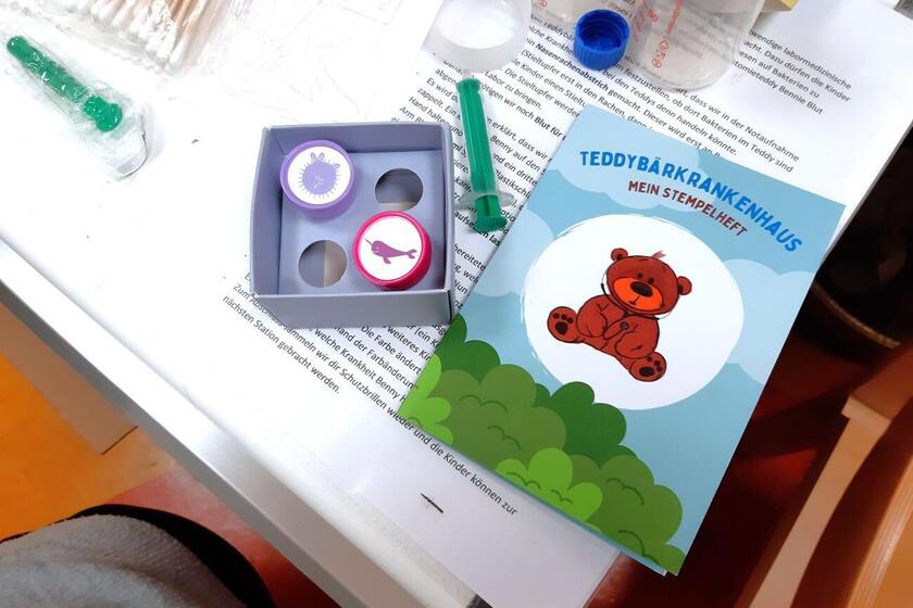 Am Dienstag, 5. November besuchte eine Gruppe der Oldenburger Johanniter-Kita Deelweg das Teddybärenkrankenhaus. An zwei aufeinanderfolgenden Tagen gaben Studierende der Fachschaft Medizin an der Carl von Ossietzky Universität Kindern die Möglichkeit, sich spielerisch dem Krankenhaus-Alltag anzunähern. Zahlreiche Kita-Gruppen waren zu Besuch. Untersuchungen, Tests und Behandlungen werden in vereinfachter Form an Kuscheltieren demonstriert. Das soll Kindern die Angst vor dem Arztbesuch nehmen. Um einen guten Eindruck zu bekommen, durchlaufen die Kinder mehrere Stationen. Los ging es mit einer Untersuchung. Die Kita-Kinder hatten ihre eigenen Kuscheltiere mit dabei. Bären, Faultiere und mehr wurden abgehört, vermessen, geröntgt und bandagiert. Bei vielen Kuscheltieren konnte eine Diagnose erstellt und die passsende Medizin in der Teddy-Apotheke abgeholt werden. Traubenzucker, Malstifte und Badebomben in pink und blau waren die Therapie. Doch es gab auch härtere Nüsse zu knacken. Also: Auf ins Labor. Dort nahmen die Kleinen einem besonders tapferen Teddy Blut ab und untersuchten, welche Krankheit ihn wohl plagen könnte - natürlich mit Schutzbrille. Darauf folgte die dramatische Blinddarm OP von Benni Bär. Nach all der Aufregung ging es für das große Finale raus vor die Kinderklinik. Feuerwehrkräfte zeigten den Kindern ihren Rettungswagen und was sich darin alles befindet. Ein schöner Abschluss, der die Kinder sichtlich begeisterte.
