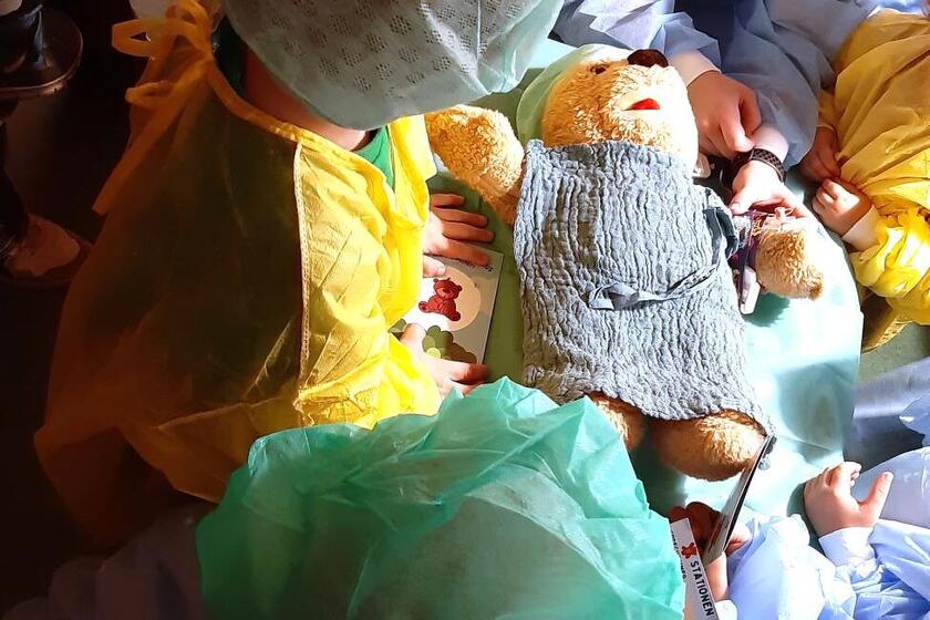 Die Lage ist ernst: Benni Bär geht es schlecht. Sein Bauch tut weh. Es kommt der Verdacht auf, es könnte der Blinddarm sein. Nun muss es schnell gehen. Die Kinder der Johanniter-Kita Deelweg machen sich auf dem Weg zum OP und legen Kittel, Hauben und Masken an. Studierende der Universität Oldenburg haben schon alles vorbereitet und Benni Bär auf den OP-Tisch gelegt. Nun ist es an den Kindern, ihm erst eine Betäubungsspritze zu geben, die Beatmung sicher zu stellen und dann - mit der Zauberpinzette - den Reißverschluss an seinem Bauch zu öffnen, um den plüschigen Blinddarm zu entfernen. Geschafft! Benni Bär hat noch ein langes leben voll Schmusen und Kuscheln vor sich.