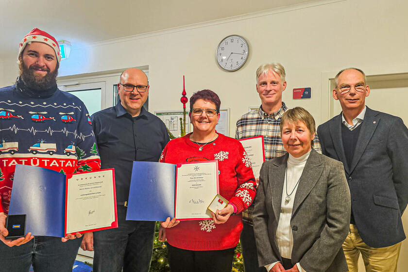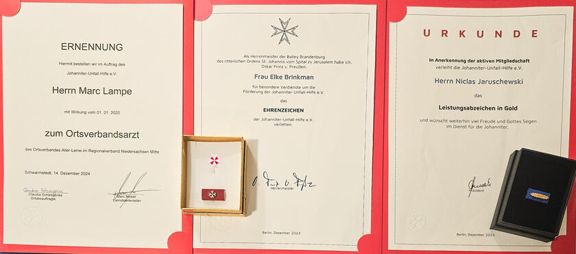 Beim Jahresabschlussdienst wurde nicht nur auf das Erreichte zurückgeblickt, sondern auch besondere Verdienste gewürdigt. Ein Höhepunkt war die Verleihung des Ehrenabzeichens der Johanniter-Unfall-Hilfe e.V. an Elke Brinkman, eine selten vergebene Ehrung, die ihr langjähriges Engagement und ihre außergewöhnliche Einsatzbereitschaft würdigt. Zudem wurde Marc Lampe als neuer Ortsverbandsarzt berufen, während Niclas Jaruschewski mit dem Leistungsabzeichen in Gold für seine Verdienste ausgezeichnet wurde.