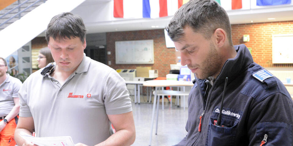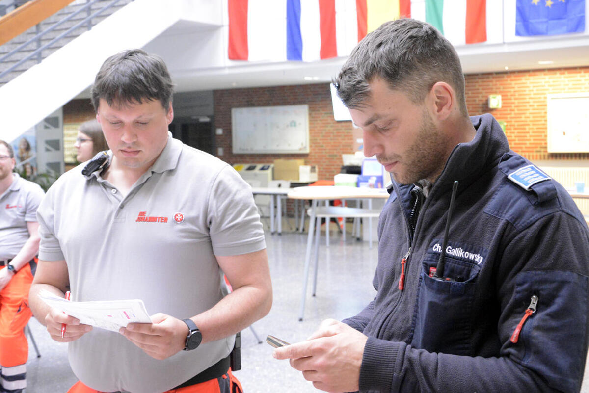 Insgesamt erwarten die Johanniter einen ruhigen Dienst. „Die Zahl der Einsatzkräfte ist eigentlich für diese Veranstaltung zu hoch“, erklärt Colter. Grund sei, dass die Johanniter das „Erlebnis Turnfest“ für eine Stabsübung nutzen. Bei der Übung mit dem Namen „Sprintender Sebastian“ geht es darum, die Arbeit von Stab und Einsatzkräften unter Realbedingungen zu testen. Auch die Betreuungsgruppen und die Verpflegungsgruppe nutzen die Veranstaltung für Übungen. Die Betreuungsgruppe, die sich sonst um evakuierte Menschen zum Beispiel bei Bombenräumungen oder Zugausfällen kümmert, übt die Unterbringung einer unbekannten Zahl Menschen. Die Verpflegungsgruppe hat den Auftrag, eine ebenfalls unbekannte Zahl Personen zu verpflegen, ohne dabei feste Infrastruktur zu nutzen. „Natürlich darf die Übung nicht den Realeinsatz gefährden, deshalb arbeiten wir mit einigem Überhang“, sagt Colter. Zudem erhöhe es die Sicherheit der Turnfest-Besuchenden. Denn wenn tatsächlich eine größere Lage eintritt, kann die Übung sofort abgebrochen werden. „Dann stehen alle Kräfte voll für den Einsatz zur Verfügung“, erklärt Colter.