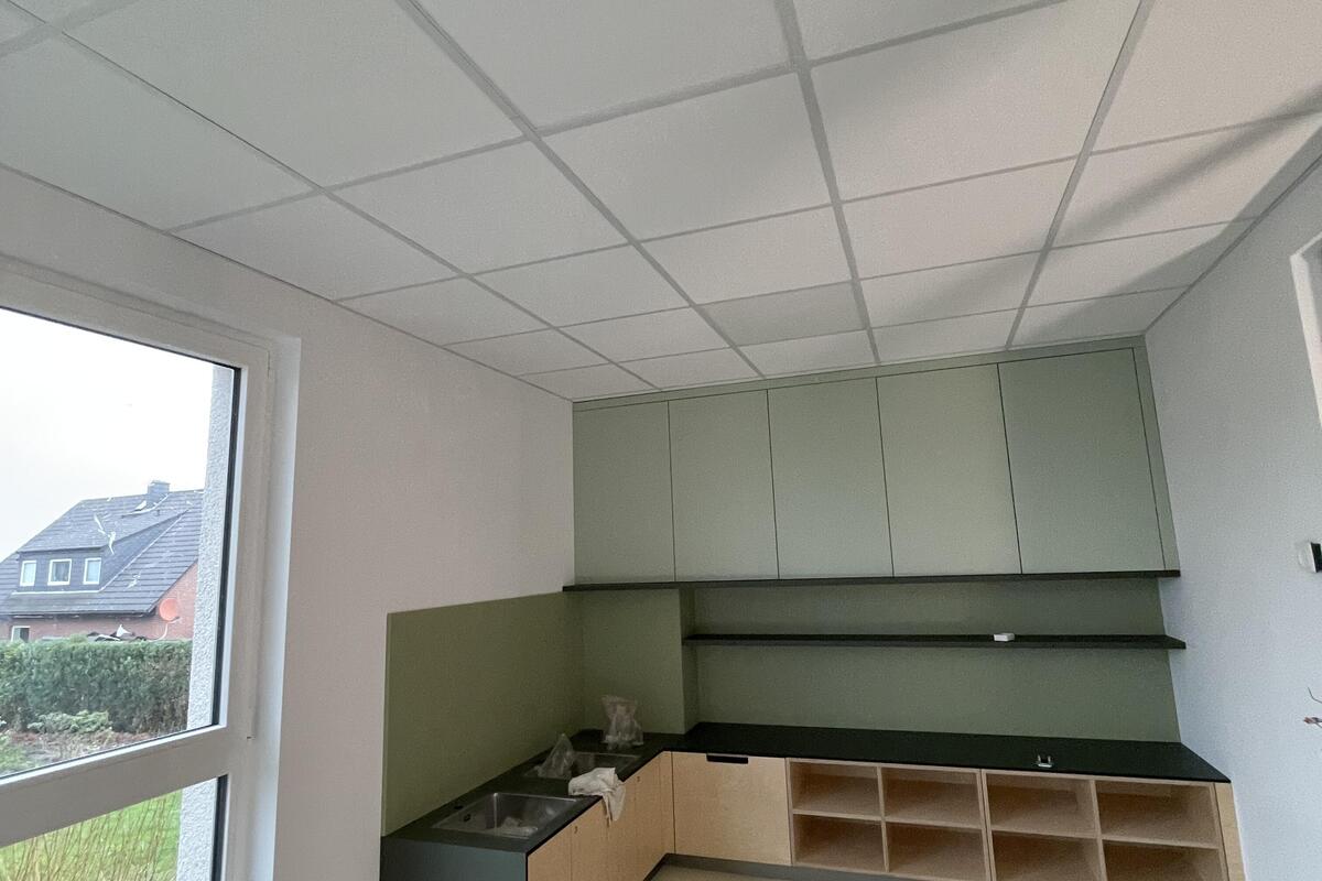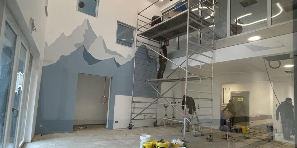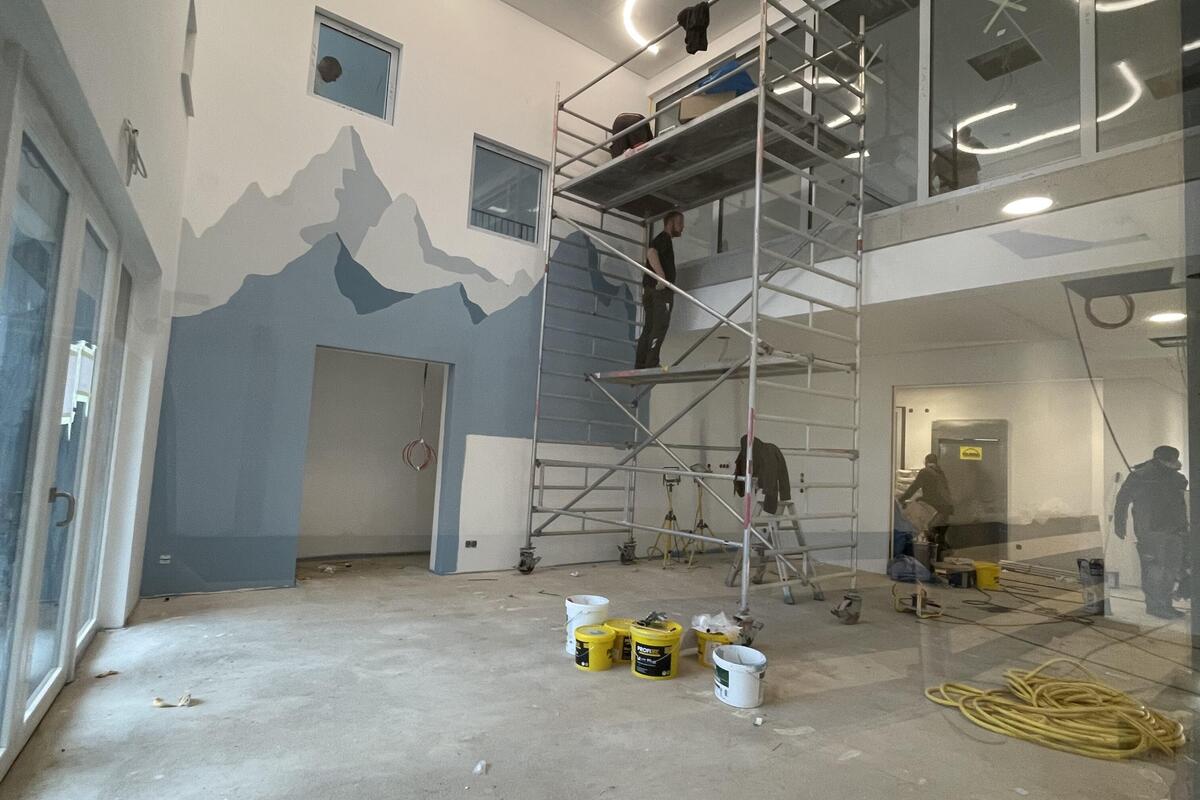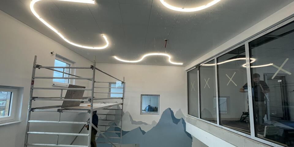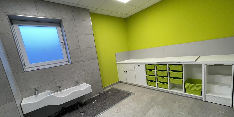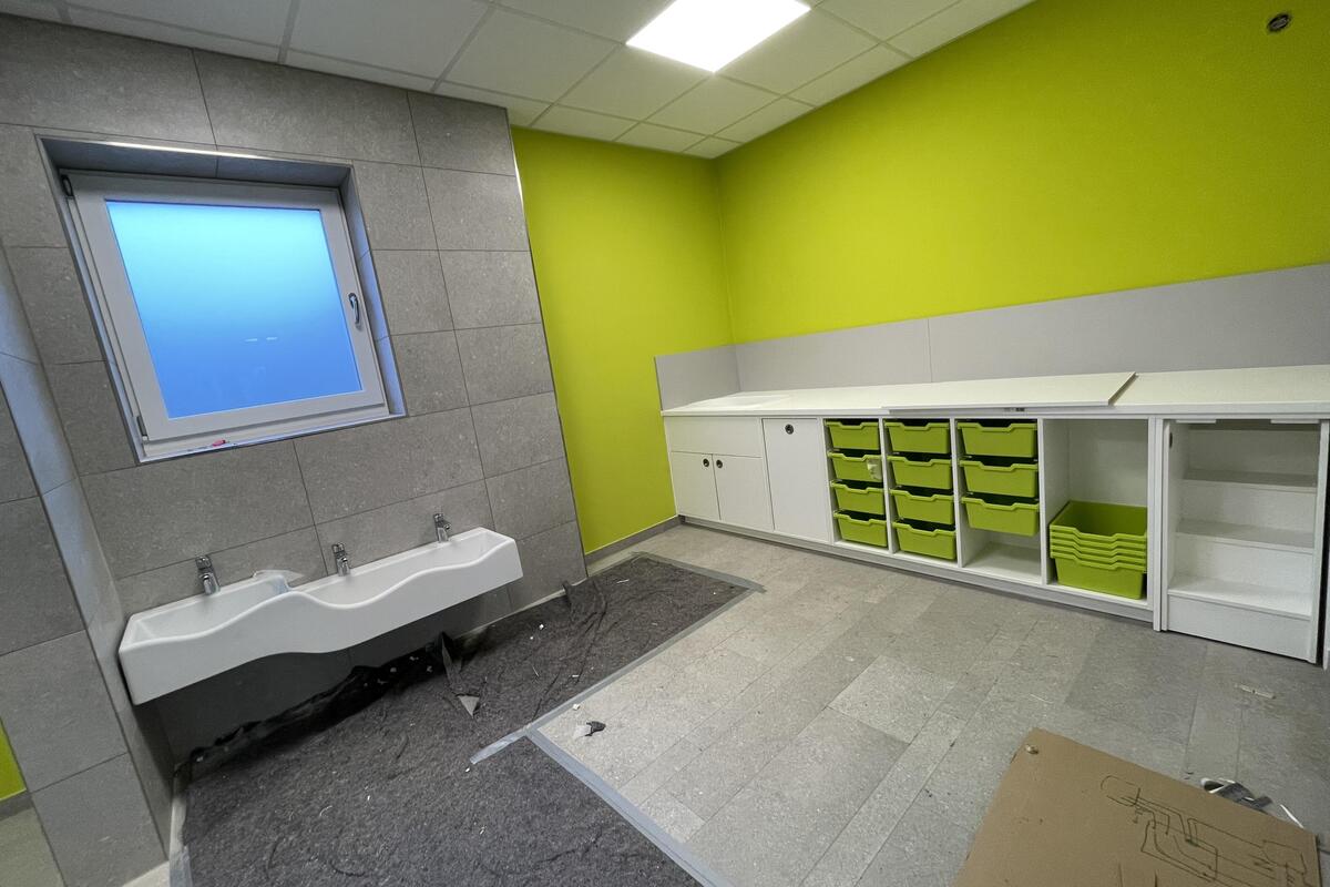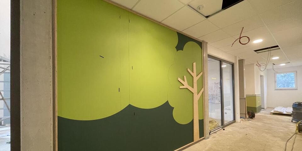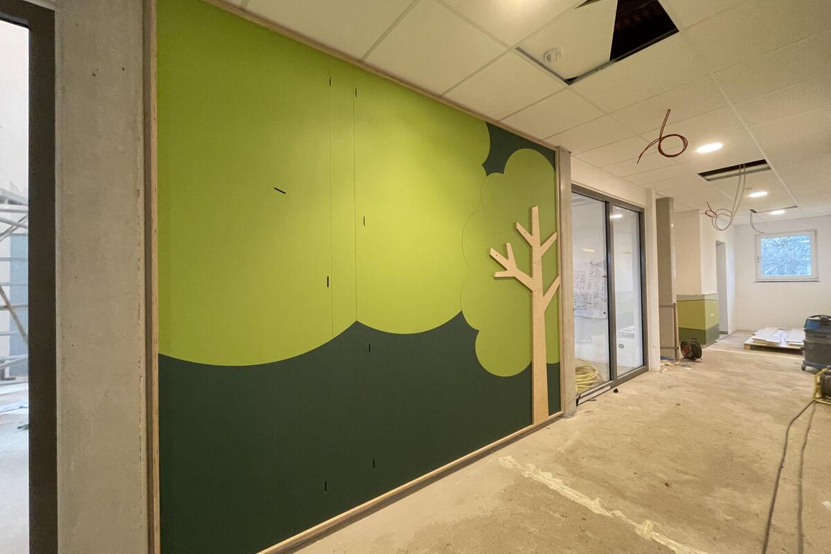 Fast täglich schaut Stephanie Springmann als Leiterin des Familienzentrums mit angeschlossener Kita derzeit auf der Baustelle vorbei. Der Zauber liegt im Detail und kann selbst die erfahrene Pädagogin immer wieder begeistern. Im Flur gibt es als Dekorationselement beispielsweise einen Baum mit Messlatte, an der die Kinder ihr körperliches Wachstum werden ablesen können. Auf dem Außengelände stehen die ersten Spielgeräte, darunter ein Matschtisch mit Wasserpumpe, ein großes Kletterelement und Holzhütten zum Verstecken. Und im ersten Stock steht der Bereich für die Mitarbeitenden kurz vor der Fertigstellung. Besonders wichtig war es dort, einen Raum für ruhige Besprechungen, aber auch störfreie Arbeitsplätze zum Beispiel für die Dokumentation der Entwicklungsberichte zu schaffen.