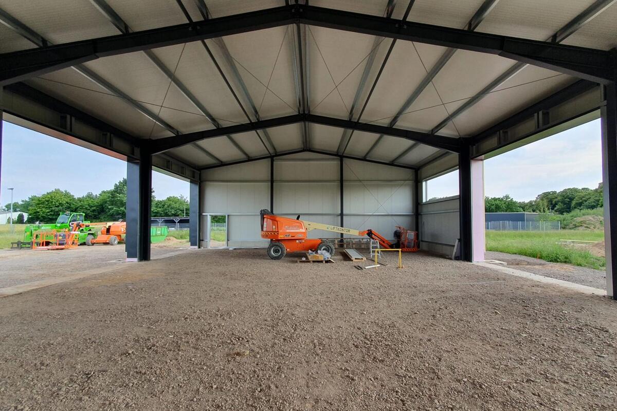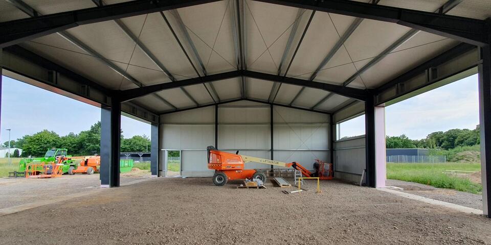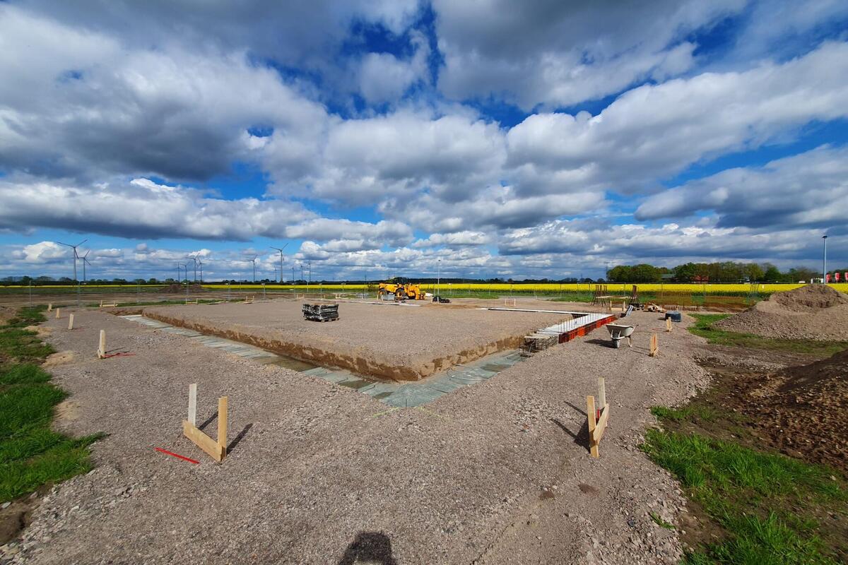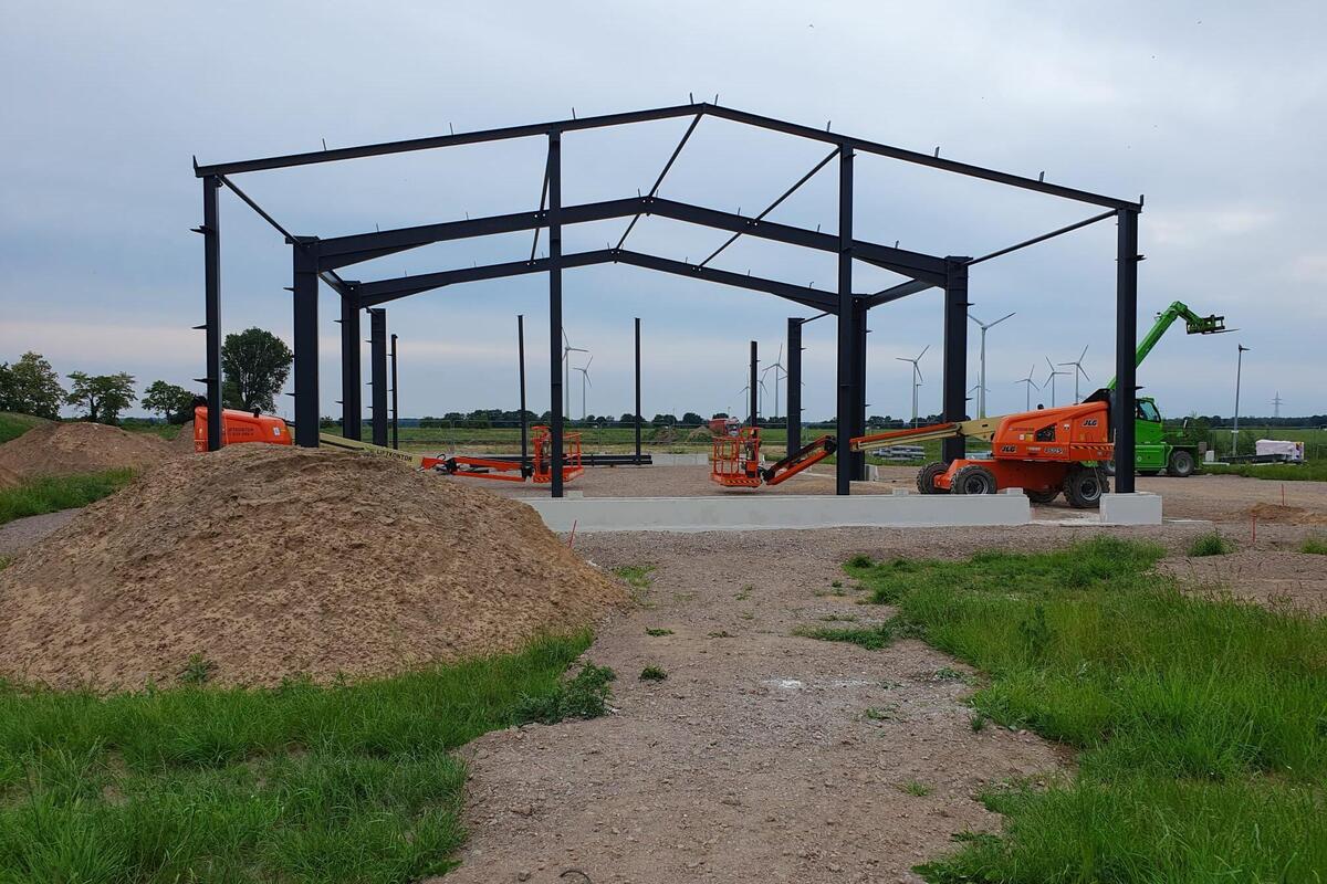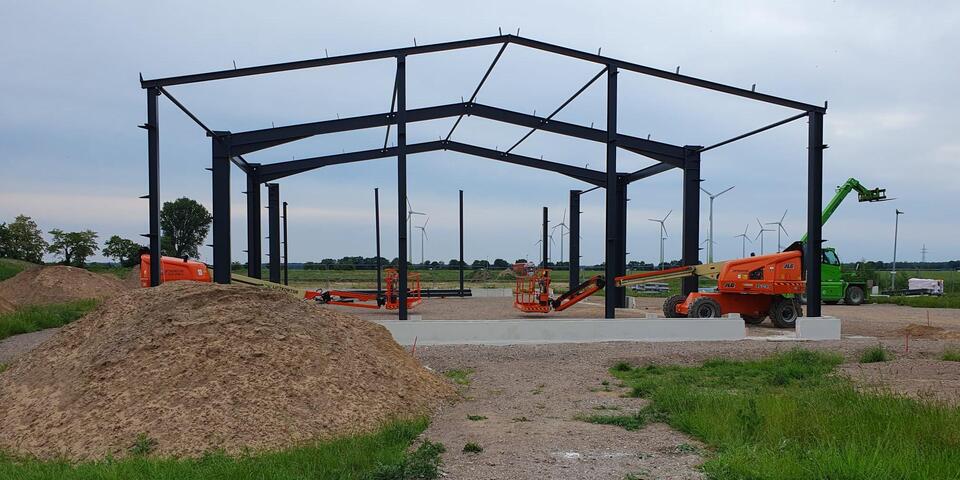 Ende Juni; die Sonne scheint über Landesbergen, nur wenige Wolken sind am Himmel zu sehen – und es weht kaum Wind. Fachleute haben schon im Mai das Dach auf die neue Fahrzeughalle an der Baumeisterstraße 3 montiert. Seither kamen auch andere Teile des Rohbaus hinzu. Alles läuft nach Plan: Mit der bald anstehenden Inbetriebnahme des Neubaus können die Landesberger Johanniter ihren Fuhrpark für den ehrenamtlich organisierten Katastrophenschutz erstmals an einem Ort unterbringen – und sind damit noch besser für ihre Aufgaben sowohl in den Landkreisen Nienburg und Schaumburg als auch überregional gerüstet.