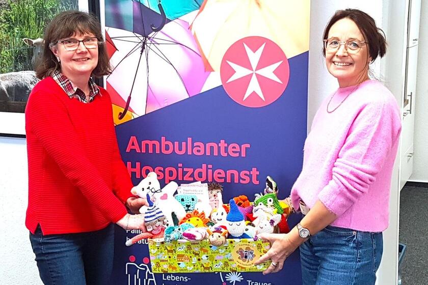 Hospizkoordinatorin Christiane Brod, die ehrenamtlichen Begleitungen Conny Minx, Sandra Romano, Claudia Siebers und Ortsbeauftragte Marion Logemann nahmen Petra Kesse mit Kaffee und selbstgebacken Kuchen am Freitag, 4. April in Empfang. Kaum war der Kaffee ausgeschenkt, zeigte sich auch schon die Magie der kleinen Plüschwesen und, dass sie in den Menschen Emotionen wecken. Ortsbeauftragte Marion Logemann streifte sofort eine Kindheitserinnerung. Sie erzählte von ihrem Teddy, den sie als Kind überall mithin nahm. Irgendwann war er durch das Kuscheln an einer Stelle im Gesicht abgewetzt und bekam kurzerhand eine Augenklappe. Kesse berichtete, dass die Kuscheltiere zwar oft an Kinder gingen aber auch in Seniorenheimen sehr beliebt sind. Sandra Romano hat Erfahrung in diesem Bereich. Sie sagte, gerade Menschen mit fortgeschrittener Demenz, die nicht mehr orientiert und ängstlich sind, geben die kleinen Gefährten Sicherheit: „Es sind richtige Rettungsanker.“ Bei älteren Menschen sind auch gerade die sehr einfachen Püppchen beliebt, weil sie an Spielsachen aus der Kindheit erinnerten, die damals noch nicht so perfekt waren und meist selbstgemacht, sagte Kesse. Romano interessierte sich dafür, wie die Tiere hergestellt werden. Kesse erklärte, dass Ehrenamtliche die Kuscheltiere nach genauen Vorgaben und mit festgelegten Materialien herstellen. Anleitungen gibt es im Internet auf der Website des Vereins und das Material kann selbst gekauft oder vom Verein bezogen werden, der es durch Spenden finanziert. Die Tiere müssen Hygienestandrads erfüllen und zur professionellen Sterilisation geeignet sein. Die Plüschtiere werden dann in Bergisch-Gladbach in einem Lager gesammelt und verschickt, sobald die Verteilenden wieder Bedarf haben. Der Verein Trostteddy wurde im März 2011 gegründet. Mehr als 250 Ehrenamtliche in ganz Europa häkeln und stricken die Bären, Kuscheltiere und Fantasiewesen in allen Farben, um Menschen in schweren Stunden etwas Freude zu schenken. Kesse kann gezielt einen Satz bestellen, beispielsweise nur Teddys oder sich überraschen lassen. Dann kommt ein Karton voll mit Teddys, Kätzchen, Walen, Uhus, Fantasiegestalten, Elefanten und kleinen Männchen. Seit neuestem gibt es Polizisten und Backenzähne, die in der Logopädie eingesetzt werden. Kesse verteilt die Tiere, wo sie kann und sucht gezielt Einrichtungen und Verbände. So stieß sie auf die Johanniter. Für Christiane Brod ein Segen. Gerade wird eine Familie mit kranker Mutter und einem noch jungen Kind betreut. Für das Kind ist auf jeden Fall ein Kuscheltier reserviert. Bei diesem Thema kamen die Frauen auf das Thema "Sorgenfresser" und "Sorgenpüppchen". Bei ersteren können die Besitzer ihre Sorgen auf Zettel schreiben und in Fächer am Sorgenfresser oder in den Mund stecken. Die Püppchen sind Zuhörer. Kesse erklärte, dass der Verein sie auch im Sortiment hat und sie gern mit einem Satz wiederkommt. Die Frauen vom Hospizdienst waren begeistert. „Gern, das ist eine wertvolle Unterstützung“, freute sich Brod.