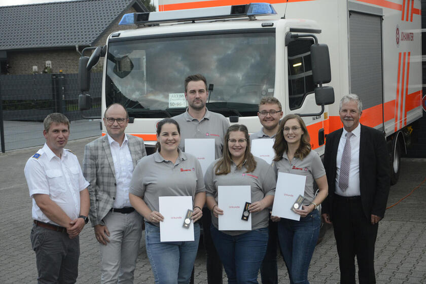 Andreas Rempe machte es spannend. Und kurz. „Ich habe in der vergangenen Woche die tollsten Gerüchte gehört“, sagte der Ortsbeauftragte des Ortsverbands Garrel der Johanniter-Unfall-Hilfe zu Beginn eines Helfertreffens, zu dem er ausdrücklich alle Ehrenamtlichen eingeladen hatte. „Um es kurz zu machen: Ich möchte heute allen Ehrenamtlichen, die nach der Hochwasser-Katastrophe 2021 in Ahrweiler im Einsatz waren, die Fluthilfemedaille des Landes Rheinland-Pfalz überreichen. Und damit bin ich mit meiner Rede auch schon am Ende.“ Rempe überließ es lieber den Geehrten zu reden. Julia Einhaus, Alexander Möller, Marina Fock, Larissa Lampe und Fabian Kösterke bekamen von Rempe im Auftrag der Ministerpräsidentin des Landes Rheinland-Pfalz, Malu Dreyer, und des Staatsministers des Inneren Michael Ebling „in Anerkennung selbstlosen Einsatzes während des Hochwassers“ die Fluthilfemedaille überreicht. Manuela Büscher, Pheline Ducamp, Aileen Fock, Dennis Kuper und Kevin Lehwald waren nicht zugegen, bekommen die Medaille aber nachträglich verliehen.