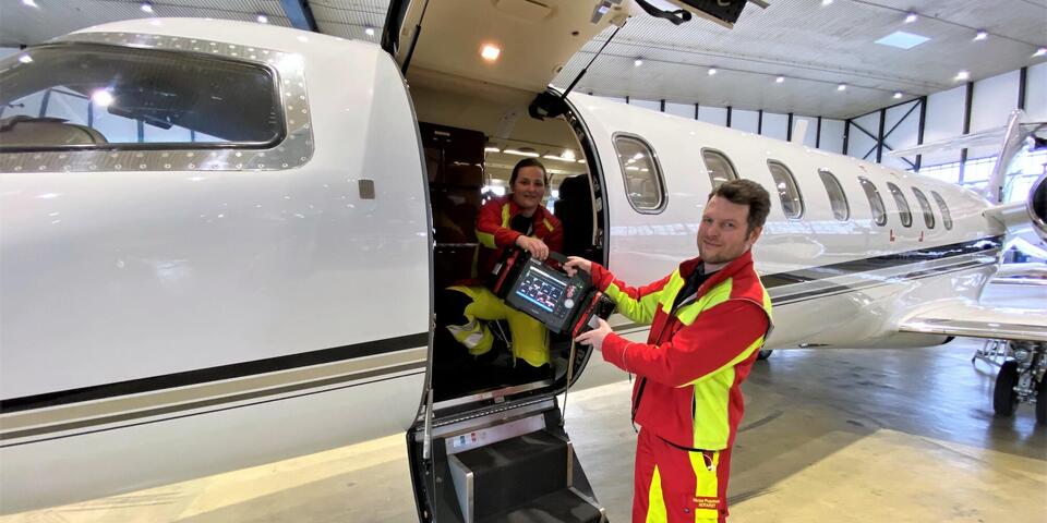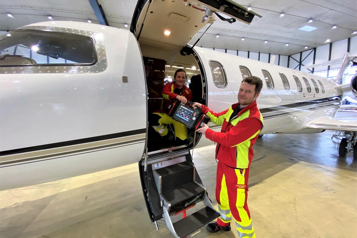 Keine zwölf Stunden nach Karsten Reckzehs Hilferuf in der Alarmzentrale haben Krahé und seine Leute mit Finnland Details wie Transportfähigkeit und medizinische Daten geklärt. Dann kommt der erlösende Anruf bei Heike Hachmeier: „Wir holen Sie heim.“ Das Ehepaar kann aufatmen. Theoretisch ginge das auch auf dem Landweg; die Johanniter schicken dann beispielsweise Krankentransportwagen auf die Reise. In Hachmeiers Fall kommt wegen der Entfernung und der Dringlichkeit ein Ambulanzflug in Frage. Dafür greift die JUH auf die Learjet-Flotte eines in Köln ansässigen Charterunternehmens zurück. Die Ambulanzflugzeuge haben alles an Bord, um selbst Intensivpatient*innen sicher zu transportieren. Weltweit funktioniert das. Im Learjet ist nur Platz für ein oder zwei Patientinnen oder Patienten sowie die Medical-Crew der Johanniter. Die kleinen Ambulanzflieger sind rasch ausgelastet. „Daher sind sie auch schneller wieder startbereit“, betont Krahé. Er stellt die medizinische Begleitung zusammen und kümmert sich darum, dass eine passende Maschine mit allem aufgerüstet wird, was Heike Hachmeier braucht. An einem Sonntag, 10 Uhr, starten der Johanniter-Arzt Dr. Tobias Donath, Spezialist für Unfall- und Allgemeinchirurgie sowie für Orthopädie, und der Notfallsanitäter Andreas Scholten mit der Maschine nach Oulu. Punkt 13.30 Uhr Ortszeit sind sie dort und heben keine Stunde später mit Patientin Hachmeier an Bord wieder ab. Der Flug dauert gut drei Stunden. Die letzte Etappe vom Flughafen Hannover ins Krankenhaus übernimmt ein Krankentransportwagen. Er fährt zu Hachmeiers Wunschklinik nach Hannover.