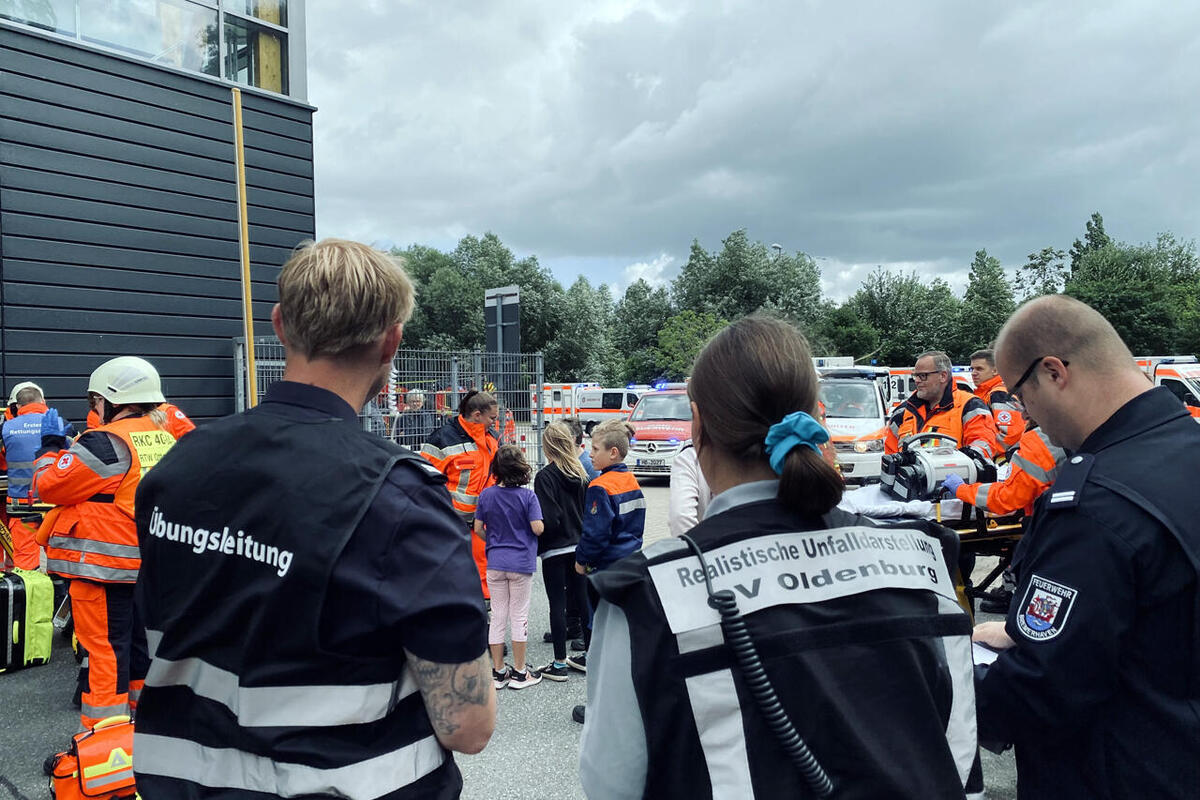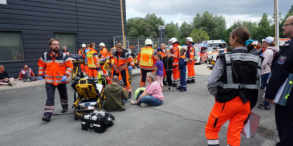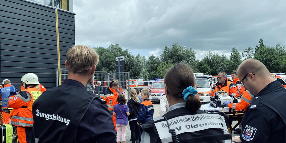 Sirenen, Blaulicht, verletzte Menschen und eine unklare Situation. Sicher ist nur eines: Jede helfende Hand wird dringend gebraucht, um das Chaos in den Griff zu bekommen und den teils schwer Verwundeten zu helfen. Mit dabei: die Realisitische Unfalldarstellung des Ortsverbands Oldenburg unter Leitung von Dr. Claudia Schmithals. Die RUD schminkte die Verletzten und stellte Verletztendarsteller.