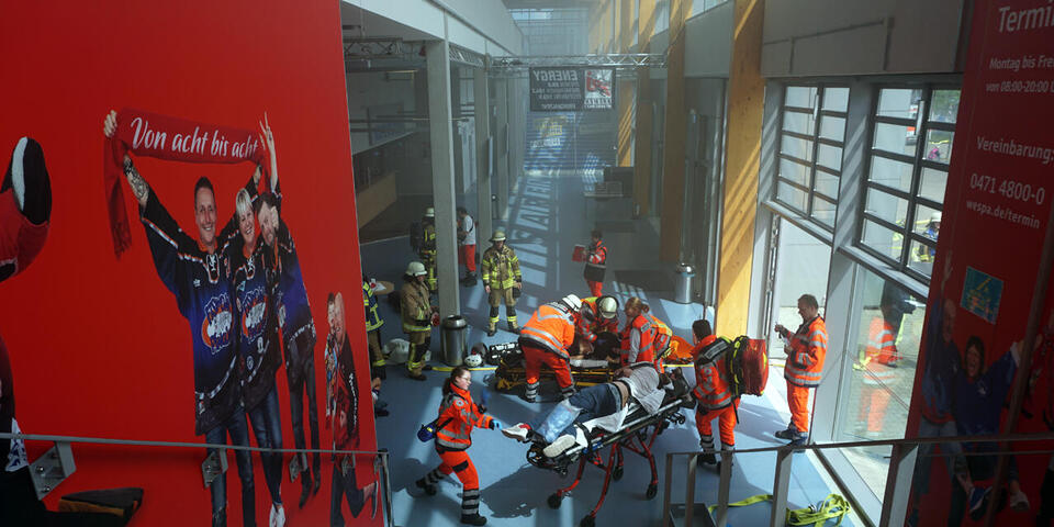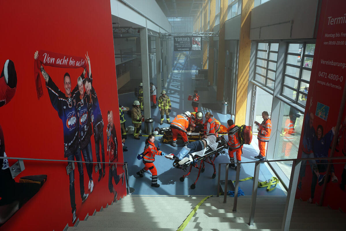 Die Johanniter aus Bremerhaven, den benachbarten Landkreisen und Bremen sowie federführend die Feuerwehr Bremerhaven und andere Hilfsorganisationen haben den Ernstfall geprobt. Das Szenario: Nach einer Fettexplosion in der Gastroküche des vollbesetzten Stadions breitete sich das Feuer rasant aus, unter anderem auch auf der Zuschauertribüne. Es gab viele Verletzte und ein paar vermisste Personen. Im Übungseinsatz waren rund 180 Hilfskräfte und viele Statisten.