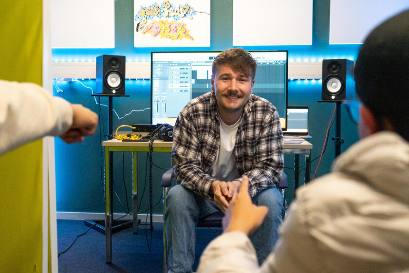 Im Studio herrscht eine konzentrierte, fast intime Atmosphäre. Sobald jemand am Mikrofon steht, wird es still. „Lass uns mal ab dem Teil mit ‚Lederjacke‘ wiederholen“, sagt Schüler einem der Jungen, der gerade seine Strophe einrappt. Neben pädagogischer Begleitung übernimmt Schüler auch die technische Betreuung: Er schneidet und mischt die Gesangsspuren, fügt Effekte wie Echo hinzu und sorgt dafür, dass das Ergebnis professionell klingt. Die fertigen Tracks erhalten die Jugendlichen direkt aufs Handy. Es kommt nicht selten vor, dass es emotional wird. „Manchmal sprechen wir danach über das, was sie gesungen haben. Wenn es im Moment nicht passt oder ich nicht der geeignete Ansprechpartner bin, leite ich das gerne an Kolleg:innen vom Jugui weiter“, so Schüler.