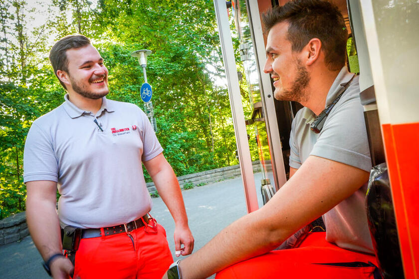 Als ausgebildeter Rettungssanitäter weiß Falco Seekircher, worüber er spricht. Sein letzter Einsatz war gerade erst auf dem Maschseefest. „Es ist die Dankbarkeit der Menschen, die uns immer wieder begegnet und die uns alle motiviert“, sagt er. In den meisten Fällen sind es bei den Einsätzen kleine Hilfsleistungen. Ein Pflaster wird benötigt oder ein Kühlpad, jemand ist umgeknickt, wurde von einer Wespe gestochen oder hat Kreislaufprobleme… Der Sanitätsdienst kann sofort helfen – macht oft aber noch viel mehr. „Wenn wir beispielsweise ein Kind bei uns haben und die Zeit dafür da ist, ermögliche ich ihm immer gerne einen Blick in den Rettungswagen. Denn wer schon weiß, wie es darin aussieht, hat weniger Angst, wenn es wirklich mal zu einem Transport kommt“, sagt Falco Seekircher, selbst Vater eines Zweijährigen.