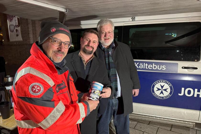 Der CDU-Kreisverband hat auf seiner Weihnachtsfeier für den Kältebus der Johanniter-Unfall-Hilfe, Ortsverband Oldenburg gesammelt. 280 Euro kamen für den guten Zweck zusammen und können für die wichtige Arbeit für Wohnungslose und andere Notleidende investiert werden. Der Kältebus ist rein spendenfinanziert. Damit sich die Spendenden ein Bild von der Arbeit der Johanniter machen konnten, wurde ein Termin vor Ort vereinbart. Das Geld überbrachten Bundestagsabgeordneter Stefan Albani und Niklas Howad, Vorsitzender des CDU-Kreisverbands Oldenburg Stadt während des Einsatzes am Freitag, 13. Dezember auf dem Oldenburger Bahnhofsvorplatz. Die Politiker suchten das Gespräch zum Kältebus-Team und zu den Gästen. Unter anderem ging es um die Entwicklung des Bedarfes in Oldenburg und wie das Projekt auch politisch unterstützt werden könnte. Das Kältebus-Team schätzte sehr, dass sich die Christdemokraten Zeit nahmen und sie den gesamten Einsatz über begleiteten. Wie nötig Unterstützung ist, zeigte sich an diesem Tag deutlich. Der Zulauf war so rege, dass die Johanniter spontan noch Milch und Brötchen nachkaufen mussten.