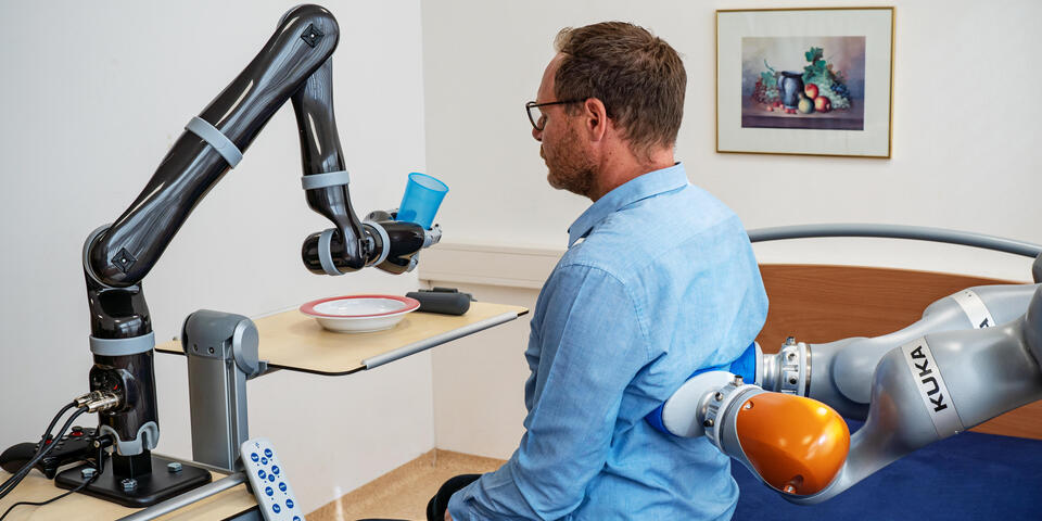 Bei der Detailstudie mit 14 Pflegeempfangenden, die unter Einschränkungen wie Lähmungen, Spastiken oder Kraftverlust litten, sollte der assistive Roboterarm unter anderen Wasser einschenken und den Becher anheben. Getestet wurde im Forschungslabor und vor Ort in den Einrichtungen oder Privathaushalten. Stephanie Raudies: „Bevorzugt wurden fast immer intuitiv steuerbare Anwendungen wie die sensorische 3D-Maus oder die Sprachsteuerung.“
