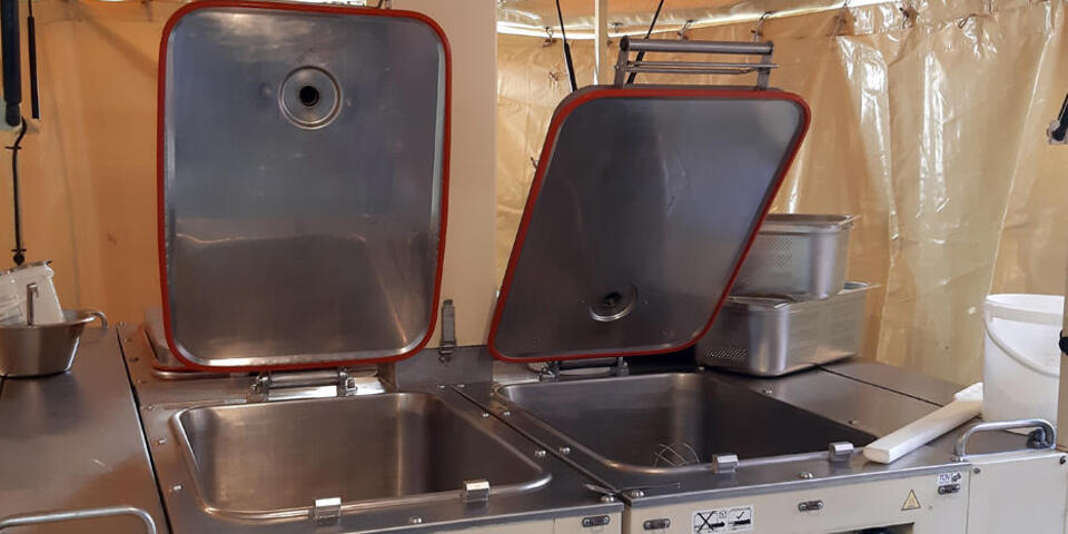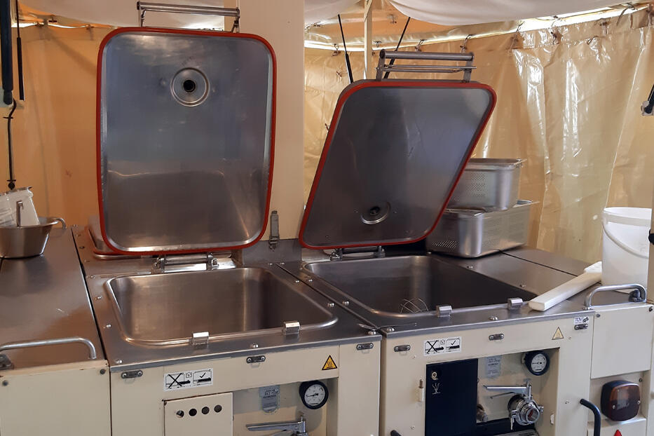 Der zweite Versorgungstrupp im Regionalverband Weser-Ems, der Ortsverband Jeverland bietet schon länger Gerichte ohne tierische Bestandteile an, Wiesmoor zog dieses Jahr nach – und musste sich erstmal zurechtfinden. Denn keiner im Team ist Vegetarier oder Veganer. Aber nicht nur mit den Gerichten erobern die Wiesmoorer Neuland. Nachhaltigkeit wird großgeschrieben, es gibt neuerdings kein Einweggeschirr mehr. Bis Mitte 2022 wurde biologisches Einweggeschirr verwendet. Das Mehrwegsystem ist gut für die Umwelt, bringt aber logistische Herausforderungen mit sich, denn irgendwie müssen Besteck, Teller und jede Menge Kaffeetassen auch wieder sauber werden. Dafür wurde mit dem Ausbilder-Auto eigens eine mobile Spülmaschine mit nach Oldenburg gebracht. Diese trat der Ortsverband Stedingen an die Wiesmoorer ab, nachdem diese die Spülmaschine immer öfter ausliehen. Hinzu kommt, dass das Mehrweggeschirr schwerer zu transportieren ist, weil es leichter kaputtgeht. „Man muss sein Auto schon gut packen“, sagt Kersten Dluzak, Leiter der Verpflegungsgruppe.