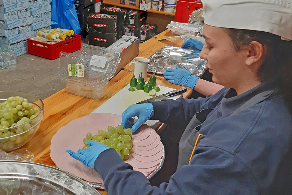Umgekehrt hält auch das Küchen-Team für die Gäste und Dienstleistenden Überraschungen bereit. Denn seit Ostern kocht Wiesmoor auch vegetarisch, beziehungsweise vegan. Während des Turnfests testen sie neue Rezepte und wie sie den hungrigen Helfern und Turnern in der Unterkunft schmecken. Meist wird ein vegetarisches Gericht gekocht und dann in einem zweiten Schritt eine Portion davon um Fleisch ergänzt. Manchmal werden direkt zwei Gerichte gekocht, beispielsweise vegetarische Frikadellen und solche aus Fleisch. Beim Reisgericht am Donnerstag hingegen konnte das Hähnchen später hinzugefügt werden. Das Team rechnet im Schnitt mit etwa 15 Prozent vegetarischen Gerichten. Es zeigte sich, dass diese immer stärker angefragt werden.