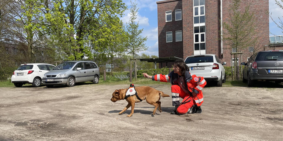 Zum Abschluss des spannenden Tages stellte sich die Rettungshundestaffel des Johanniter-Ortsverband Oldenburg vor: Julia Zenner als Helferin ohne Hund, Dr. Anke Graf mit Ola, Emma Höffmann mit Tilda, Frauke Schütte mit Ira und Staffelleiter Thomas von Seggern mit Kysha zeigten, wie sie vermisste Personen finden und anzeigen. Nach einer kleinen Feedbackrunde beendete Stephanie Henkel, Leiterin Schulsanitätsdienst, den ereignisreichen Tag.