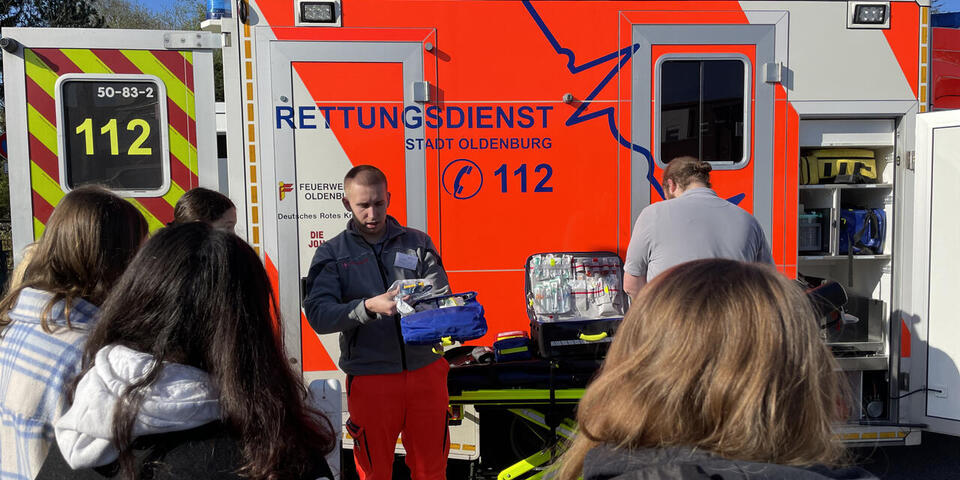„Seht ihr das rosa Osterei mit den Punkten? Zusammen finden wir es bestimmt“, ermutigt Harun die zwei Krippenkinder, mit ihm das Osterei im Bilderbuch zu suchen. Er darf heute einen Tag den Beruf eines Erziehers in der Johanniter-Krippe „Unter den Eichen“ kennenlernen. Während er und drei andere sich um die Krippenkinder kümmern, „pieksen“ sich Lenja und Lara gegenseitig in den Finger, um den Blutzuckerwert zu ermitteln. Gemeinsam mit 17 anderen Mädchen und einem Jungen bekommen sie von Hendrik Ströbel, Notfallsanitäter und Praxisanleiter, und Florian Würtz, Freiwilligendienstleistender im Krankentransport, einen Rettungswagen gezeigt. Im Anschluss dürfen die Mädchen kleine Maßnahmen, wie Blutzucker, Blutdruck und Puls messen, ausprobieren. Verbände anlegen und Herz-Druck-Massage haben sie vorher schon mit den beiden Freiwilligendienstleistenden im Schulsanitätsdienst Theresa Wessels und Milena Neid geübt. Insgesamt nahmen 24 Kinder am Zukunftstag bei den Oldenburger Johannitern teil.