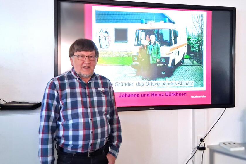 Im Besprechungsraum bei Kaffee und Kuchen übernahm anschließend Kollege Lothar Kirchgeorg, der seit den frühen 1970-Jahren bis heute im Rettungsdienst tätig ist. Kirchgeorg nahm die Gäste mit auf eine kurzweilige Zeitreise zu den Anfängen der Ahlhorner Johanniter, untermalt mit reichlich Bildmaterial. Nachdem die Besuchenden einen Eindruck des aktuellen Fuhrparks bekommen hatten, wirkte der erste Krankenwagen besonders kurios. Nach einem Industrieunfall im Jahre 1961, bei dem Hilfe erst spät kam und ein Mensch an den Folgen seiner Verletzungen starb, war klar, dass die Gemeinde einen eigenen Krankenwagen braucht. Diesen fuhren ab 1962 die Johanniter: ein ausgemusterter Wäschewagen. Der VW-Bus mit bereits 500.000 gefahrenen Kilometern trug fortan das Johanniterkreuz und wurde von der Polizei über Notfälle informiert – die ersten sechs Jahre hatte er nämlich kein eigenes Funkgerät an Bord.