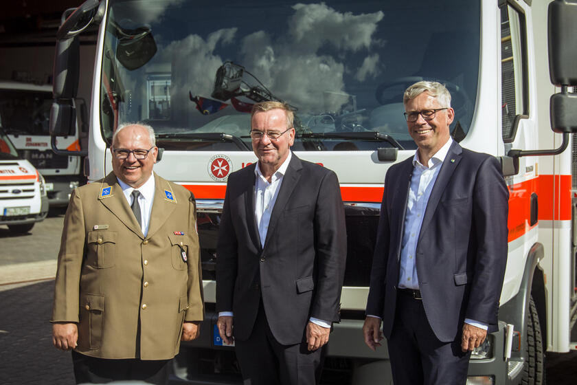 Der Besuch des Ministers war darüber hinaus Anlass, den neuen Gerätewagen Sanität sowie einen Führungskraftwagen offiziell in Dienst zu stellen. Thorsten Ernst, im Johanniter-Landesverband Niedersachsen/Bremen zuständig für den Bereich Katastrophenschutz, erklärte Pistorius die Besonderheiten und Vorzüge des Gerätewagens. Dieser kann im Katastrophenfall sämtliches Material für eine mobile Krankenstation bereitstellen. „Der Führungskraftwagen verfügt über die neueste Technik. Sogar eine Satellitenanlage ist verbaut, um in jeder Einsatzlage eine Kommunikation gewährleisten zu können“, sagte Timo Brüning. „Hier laufen bei Einsätzen alle Fäden zusammen.“ Pistorius zeigte sich beeindruckt und machte abschließend deutlich: „Die Menschen in den betroffenen Gebieten sind Ihnen so dankbar. Die Situation ist schlimm, aber das Gefühl, allein gelassen zu werden, ist das Schlimmste. Danke, dass Sie den Menschen dieses Gefühl nehmen und da sind. Machen Sie weiter so, Ihr Engagement prägt den Zusammenhalt in der Gesellschaft.“