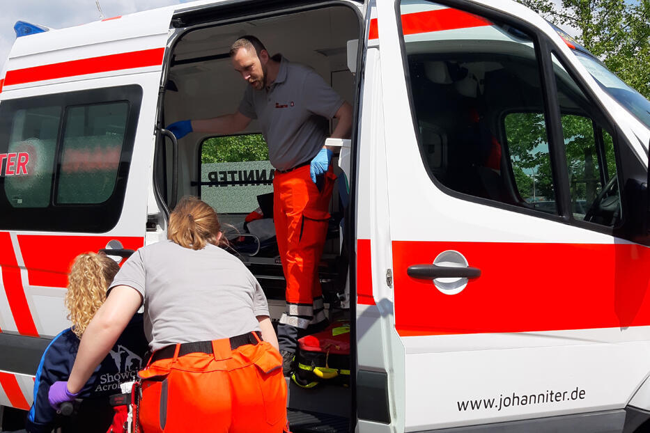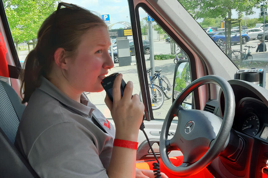 Svenja Wiedenhoeft kombiniert ihr deftiges Mittagessen aus Frikadellen, Gemüse und Kartoffeln mit einem Tee. Die Lage ist ruhig und die 19-jährige Sanitätshelferin kann zwischen kleinen Schlückchen ein Gespräch führen. Wiedenhoeft trinkt ihren Tee langsam und mit viel Milch. Rettungssanitäter Marcell Bleke ist längst fertig, drängt die junge Kollegin aber nicht. Bleke wartet geduldig. Wiedenhoeft bemerkt das nicht und fragt, nachdem Teller und Tasse leer sind, ob es losgehen kann. Es geht los – und zwar richtig. Das ungleiche Paar auf dem Krankentransport (KTW) 50/92-1 ist alarmiert, da ist es noch nicht auf den Sitzen. Die beiden Ehrenamtlichen des Ortsverbands Nordenham der Johanniter-Unfall-Hilfe sind beim Erlebnis Turnfest in Oldenburg und engagieren sich im Sanitätsdienst.