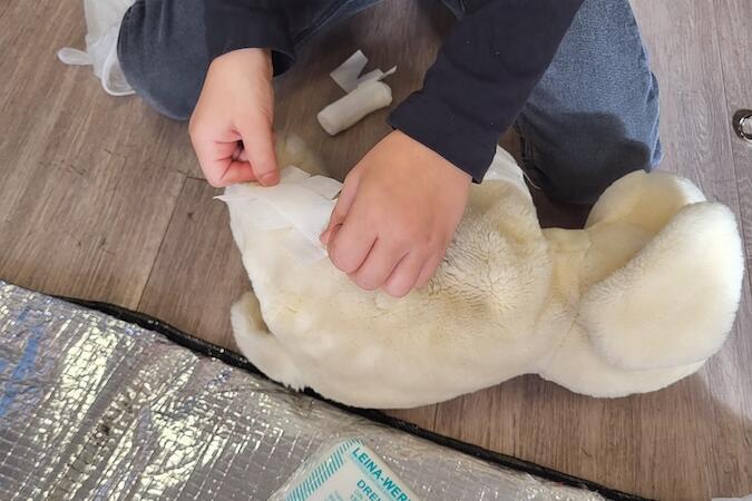 Die zukünftigen Teddy-Docs erlernten hier spielerisch alles Notwendige. „Uns ist es wichtig, dass die Kinder Einsatzkräfte in leuchtender Einsatzbekleidung als Helfende wahrnehmen und medizinisches Material und Geräte kennenlernen“, sagt Sarah Pfaffenrath, „wie Pflaster, Verbände sowie Kinder-Blutdruckmanschetten, Ohr-Thermometer, Pupillenleuchten und Stethoskop.“