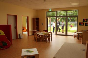 An den Eingangsbereich grenzt die eine Krippengruppe mit eigenem großen Wickel/Toiletten/Duschbereich, einem ruhig gelegenen Schlafraum und einem Gruppenraum mit vielfältigen Spielmöglichkeiten. Die Kindergarten-Gruppen befinden sich gegenüberliegend zur Krippe und sind alle über einen langen Flur zu erreichen. Die vier Kindergartengruppen verfügen jeweils über einen großen Gruppenraum mit verschiedenem Spielmaterial und einen Nebenraum für die unterschiedlichen Bildungsbereiche. Ebenfalls lädt ein großer Schlafraum nach dem Mittagessen müde Kinder zum Träumen und Ausruhen ein. Vor dem Schlafraum befindet sich ein Atelier, das von allen Kindern mit den Pädagog/-innen aber auch alleine genutzt werden kann. Auf dem angrenzenden Außengelände von 2.900 m² gibt es zwei nicht voneinander getrennte Spielplatzbereiche mit jeweils anregenden Spielgeräten für die jeweiligen Altersgruppen. Eine große Matschanlage sorgt vor allem in den wärmeren Jahreszeiten für viel Freude bei den Kindern jeden Alters. Aber auch in der Kita steht ein großer Bewegungsraum für alle Kinder zum Toben zur Verfügung. Jeden Dienstag und Donnerstag geht es zusätzlich noch mit einer kleinen Kindergruppe in eine Boulder-Halle zum Klettern.