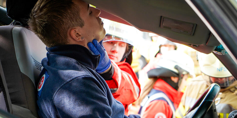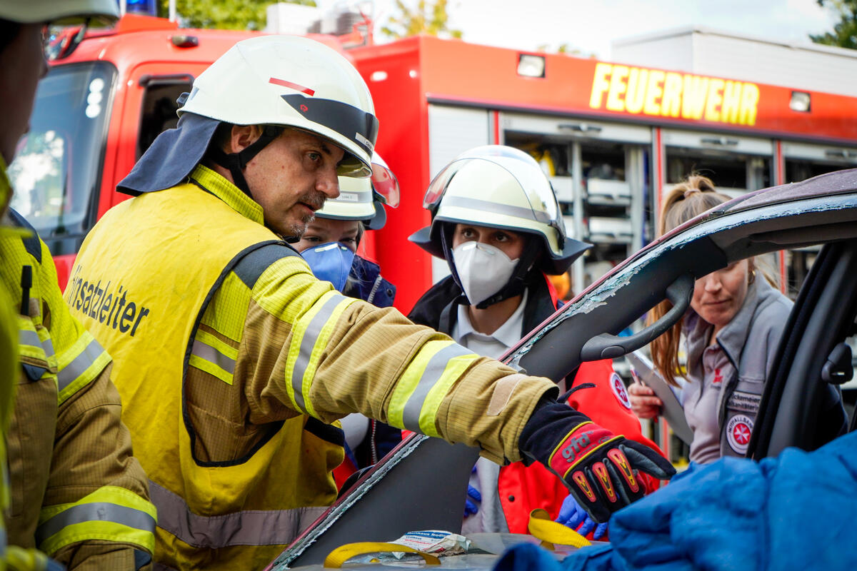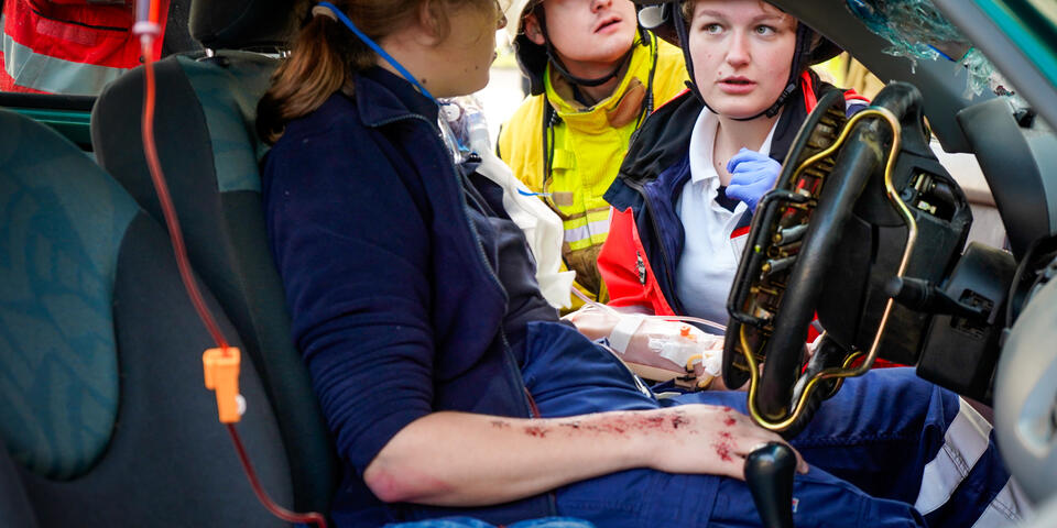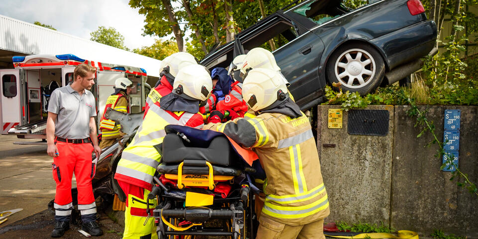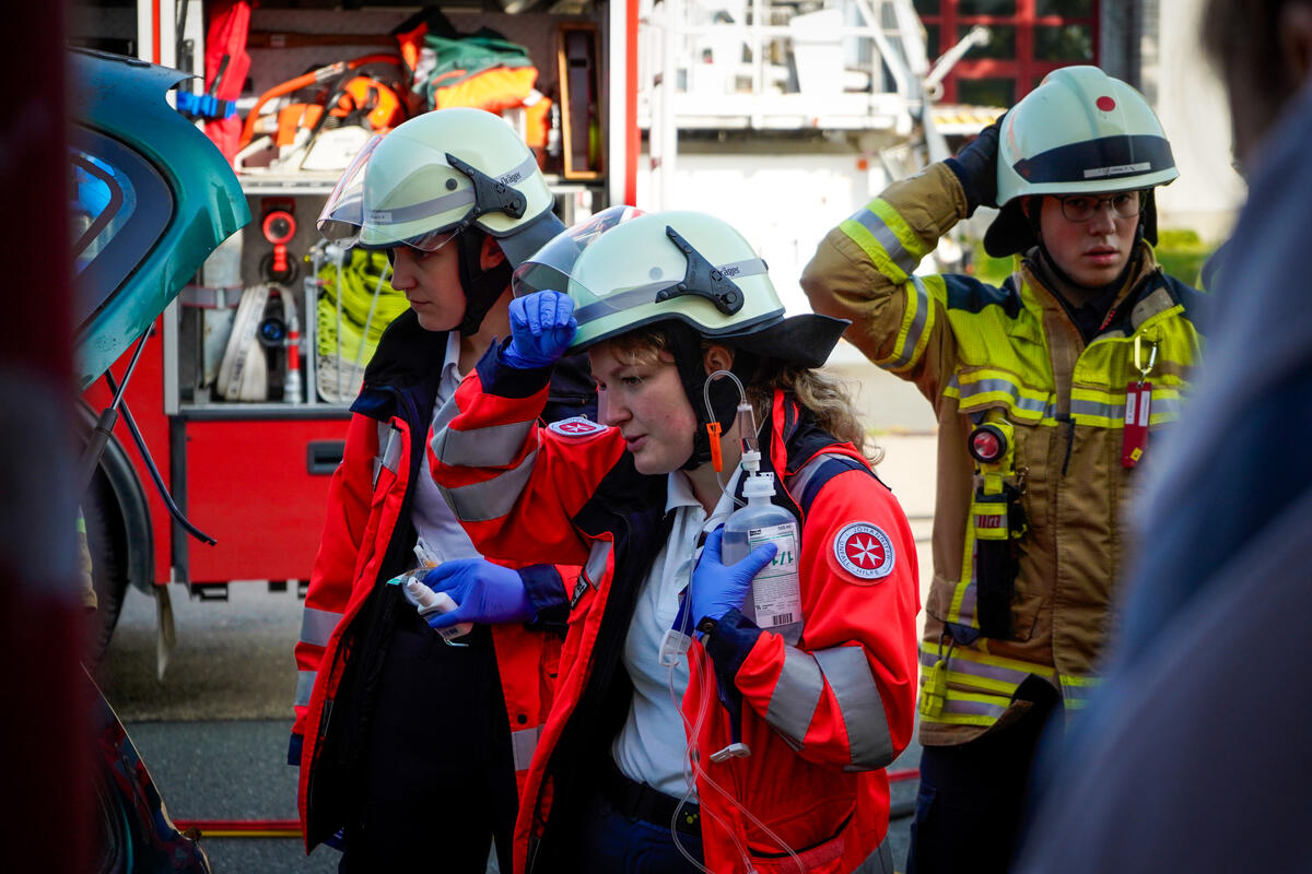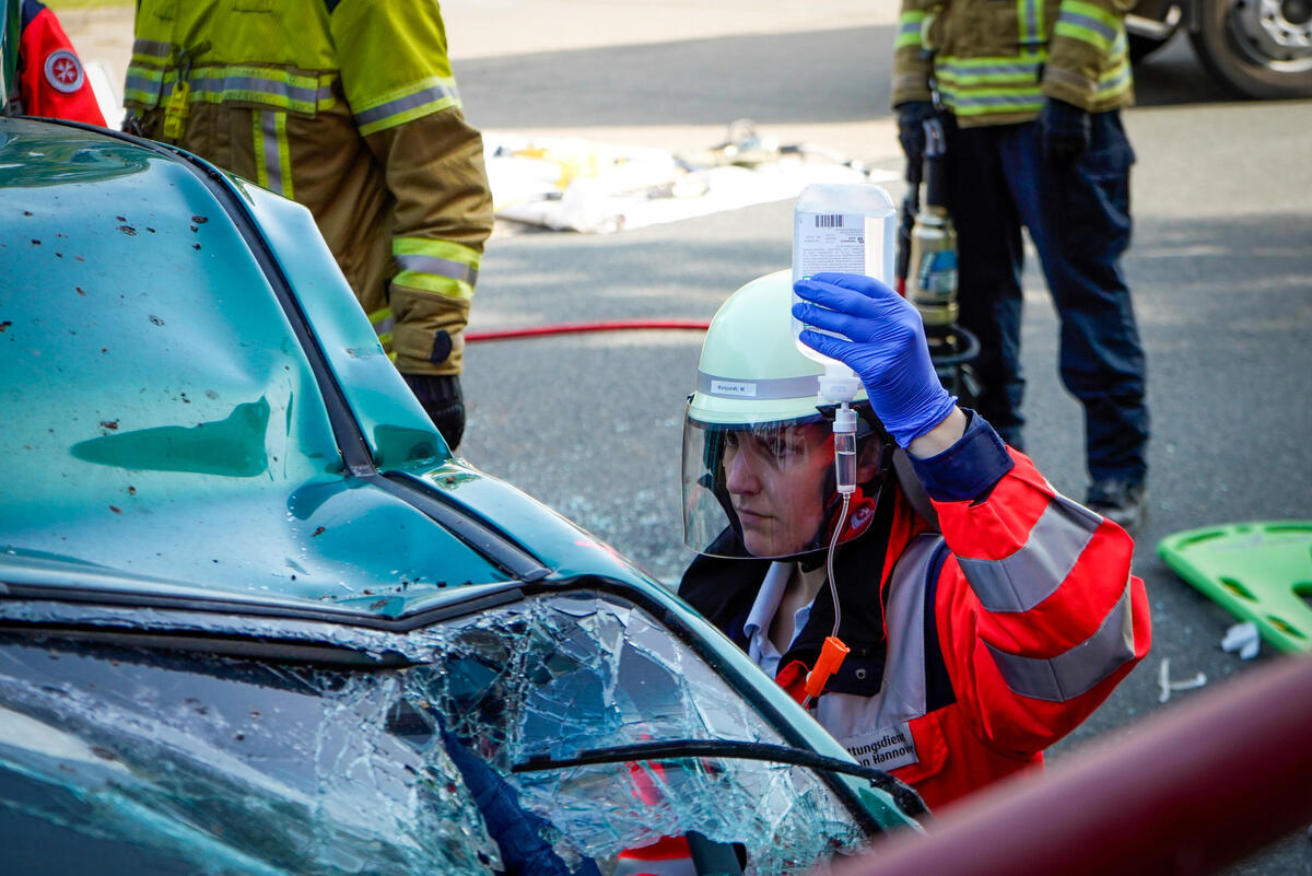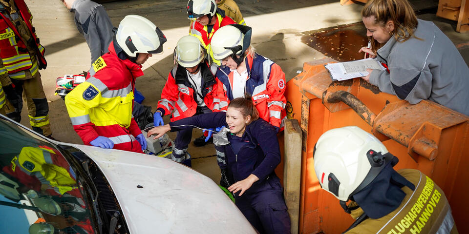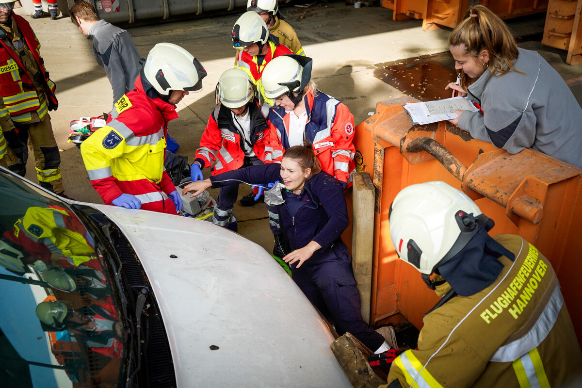 Und nicht nur das: Ein wichtiger Punkt neben dem medizinischen Aspekt ist die Kommunikation über Organisationsgrenzen hinweg. Bei Einsatzszenarien wie einem herabgestürzten Pkw aus einem Parkhaus oder einer eingeklemmten Person unter einem Fahrzeug ist eine enge und gut abgestimmte Kooperation mit der Feuerwehr unerlässlich. Im Ernstfall ist sie lebensnotwendig. „Gerade die Zusammenarbeit mit anderen Einsatzkräften war sehr lehrreich“, sagt Stella Linke, Auszubildende zur Notfallsanitäterin auf der Rettungswache Langenhagen. „Plötzlich mussten wir mehr als eine Person im Einsatz koordinieren. Diese Möglichkeit haben wir in der Schule in diesem Ausmaß nicht, das geht nur in der Praxis.“