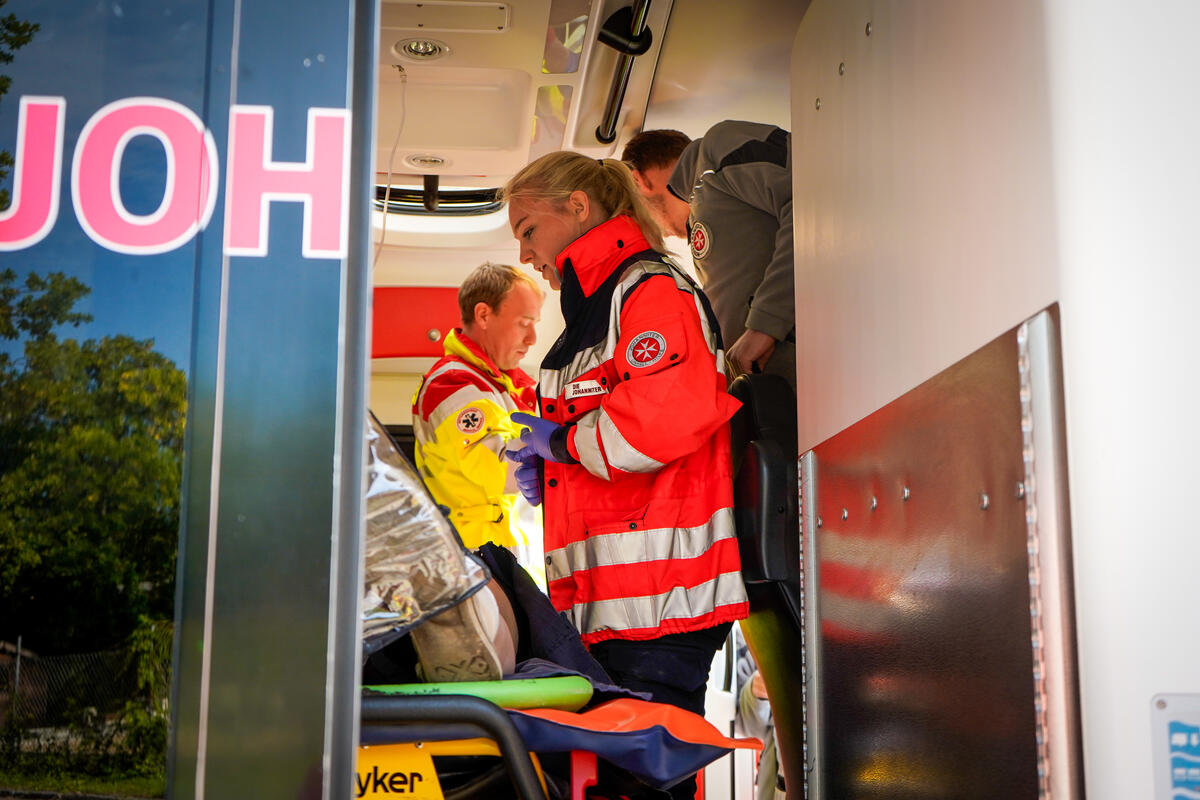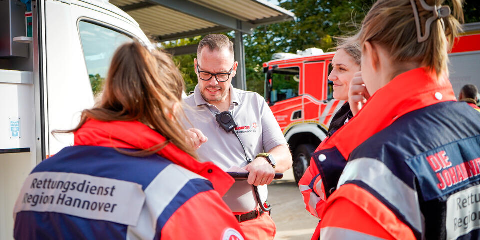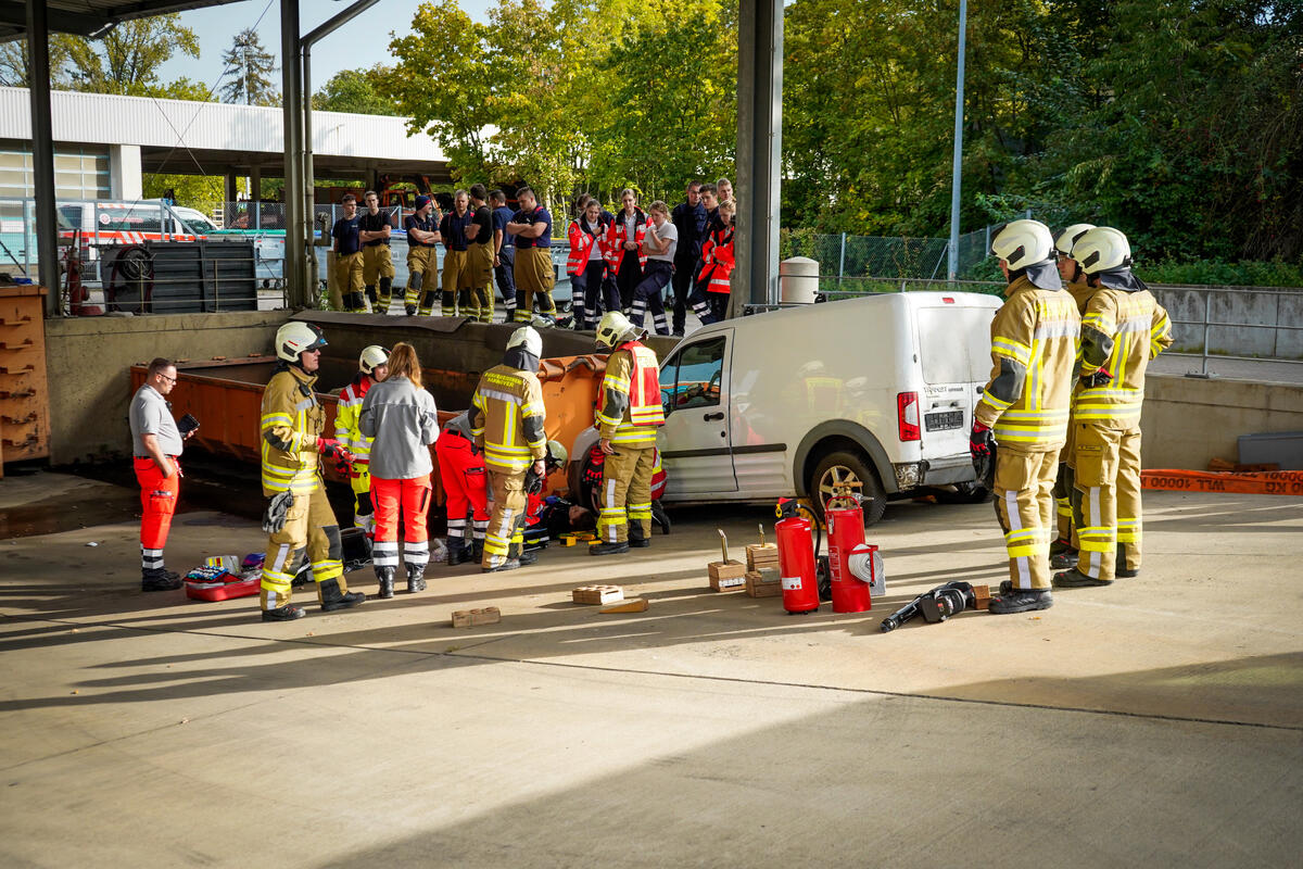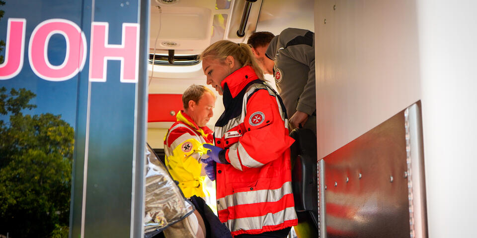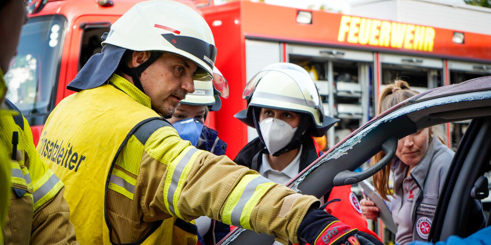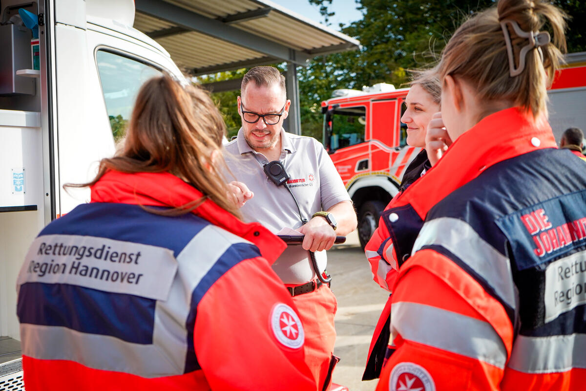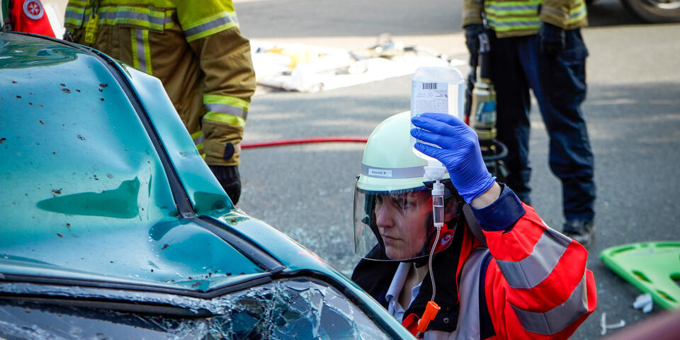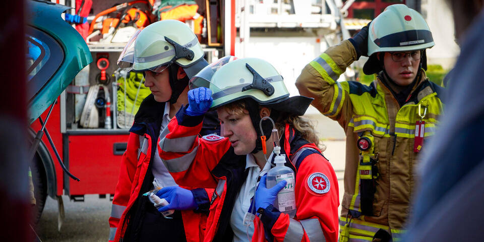 Und nicht nur das: Ein wichtiger Punkt neben dem medizinischen Aspekt ist die Kommunikation über Organisationsgrenzen hinweg. Bei Einsatzszenarien wie einem herabgestürzten Pkw aus einem Parkhaus oder einer eingeklemmten Person unter einem Fahrzeug ist eine enge und gut abgestimmte Kooperation mit der Feuerwehr unerlässlich. Im Ernstfall ist sie lebensnotwendig. „Gerade die Zusammenarbeit mit anderen Einsatzkräften war sehr lehrreich“, sagt Stella Linke, Auszubildende zur Notfallsanitäterin auf der Rettungswache Langenhagen. „Plötzlich mussten wir mehr als eine Person im Einsatz koordinieren. Diese Möglichkeit haben wir in der Schule in diesem Ausmaß nicht, das geht nur in der Praxis.“