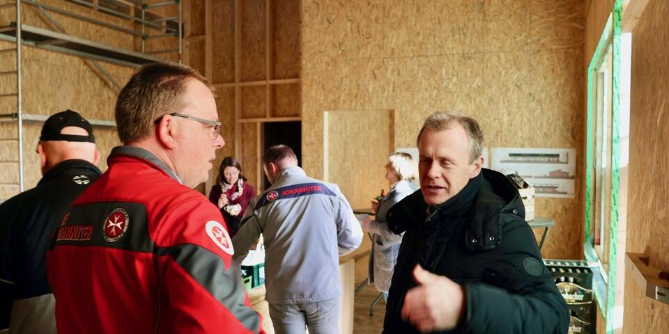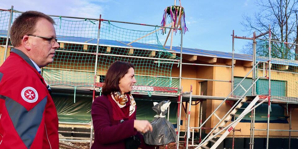 „Wir bauen hier Zukunft“, betont Dienststellenleiter Sudmann beim Richtfest und bedankt sich bei den beteiligten Firmen und kommunalen Partnern. „Wir haben eine super Zusammenarbeit mit der Kommune.“ Von Katalin Soppart, Vorstandsmitglied im Johanniter-Regionalverband Niedersachsen Mitte, bekommt Sudmann nach dem feierlichen Segensspruch der Zimmerleute einen neuen Bauhelm geschenkt. Ein Zeichen für die vielen Neuerungen im Ortsverband Landesbergen, der im Januar ein neues Team für die Rettungswache Warmsen stellt, 2026 im gerade entstehenden Service-Center inklusive seniorengerechten Wohneinheiten in Stöckse ein Betreuungsangebot „Wohnen mit Service“ aufbauen wird – und auch für Nienburg den Bau zweiter Kitas plant.