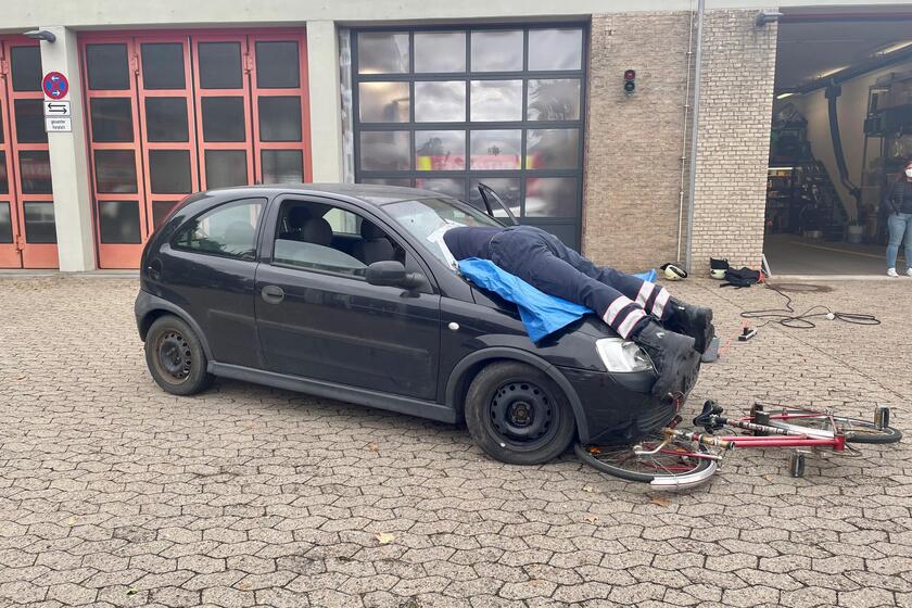 Sechs verschiedene Einsatzszenarien unterschiedlichen Schweregrades waren vorbereitet worden, die durch die drei Auszubildenden des dritten Lehrjahres in medizinischer Verantwortung und technisch von den Feuerwehrkräften abgearbeitet werden mussten. Bei den vermeintlichen Verkehrsunfallopfern handelte es sich um hauptamtlich Mitarbeitende und ehrenamtlich Helfende, die zuvor von Johanniterin Jennifer Janik RUD-gerecht geschminkt worden waren und sich schauspielerisch in Szene setzten - darunter auch Notfallsanitäter Nils Hoffmeyer als in der Windschutzscheibe steckender Radfahrer.