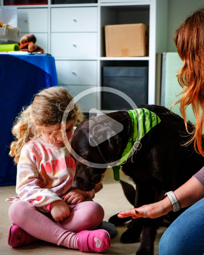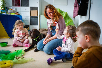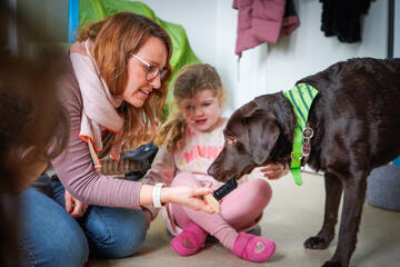 Als pädagogischer Begleithund unterstützt Dobby die Kinder außerdem dabei, ihre Gefühle besser wahrzunehmen und auszudrücken.