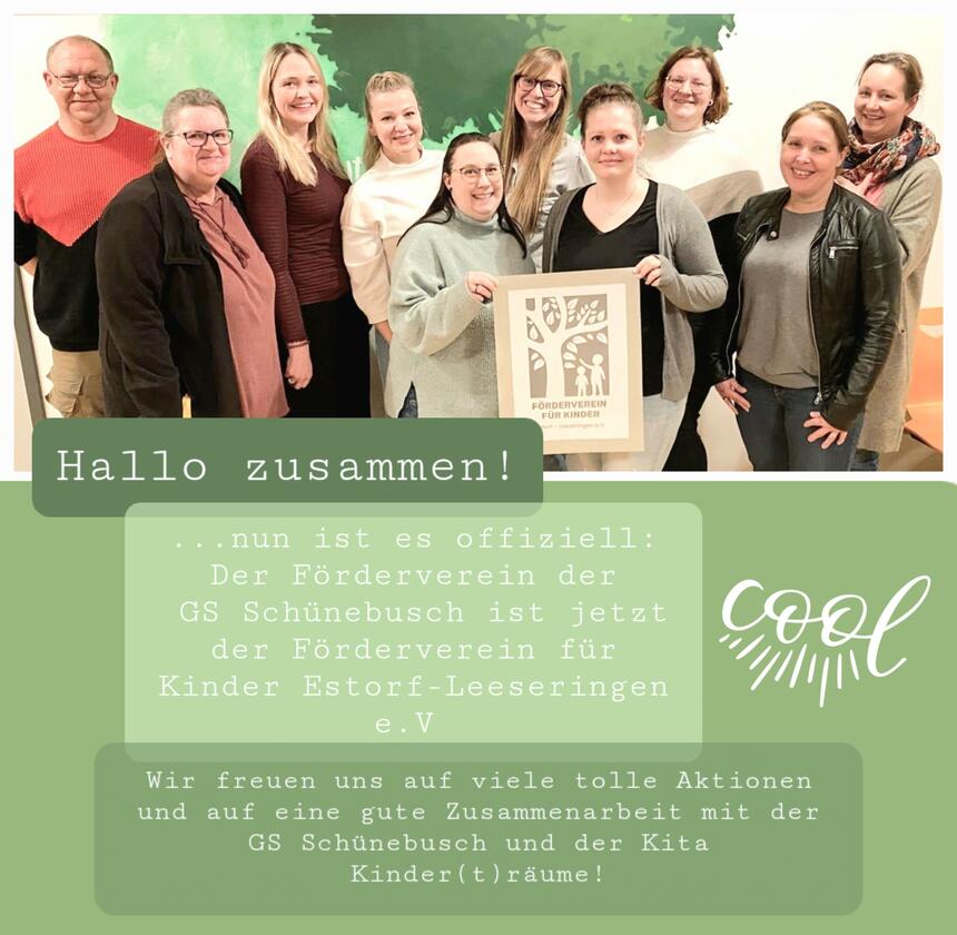 Im Januar 2026 wurde aus dem Förderverein der Grundschule Schünebusch e.V. ein neuer Verein: Seine Mitglieder haben sich die Förderung aller Kinder im Ort auf die Fahne geschrieben; davon profitieren alle Kinder unserer Johanniter-Kita Kinder(t)räume (OT Leeseringen) sowie die Schülerinnen und Schüler der Grundschule Schünebusch (OT Estorf). Viele Familien haben ihre Kinder in beiden Einrichtungen; die Eltern und alle Mitglieder des Fördervereins unterstützen sich zugunsten der Kinder gegenseitig. Sei es bei Spendenbasaren, Gemeinschaftsaktionen, Festen oder Ferienpassaktionen. Mehr Informationen gibt es vom Vorstand des Fördervereins unter dieser Mailadresse. Oder auch via Instagram. Den Mitgliedsantrag können Sie sich hier herunterladen als PDF.
