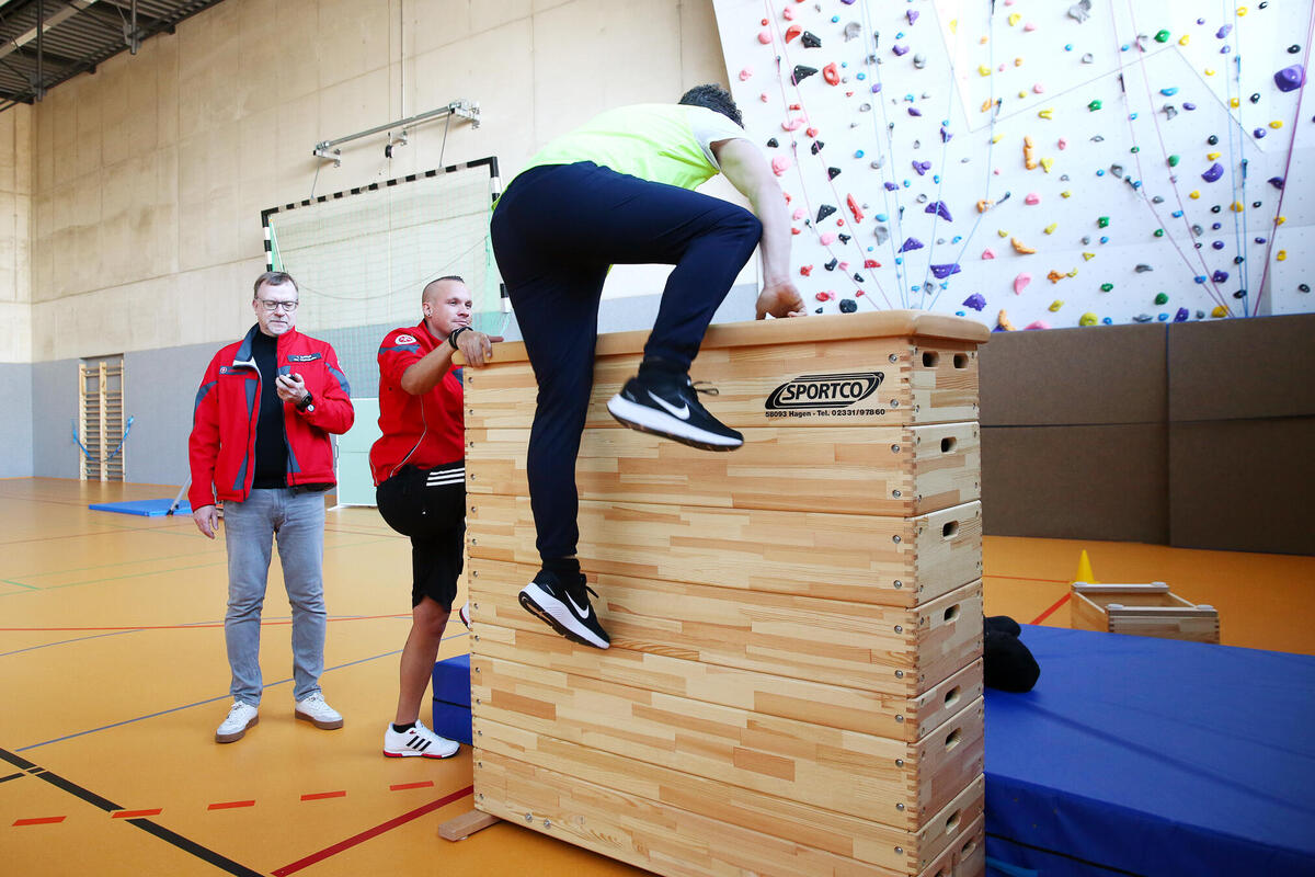 Um 12:00 Uhr erwartete die Teilnehmenden ein Sporttest, gefolgt von einem Teamspiel, das die Gruppenkompetenz und die Kooperationsbereitschaft in den Fokus rückte. Diese letzten beiden Etappen des Auswahlverfahrens spiegeln die Anforderungen wider, die im realen Einsatz auf die angehenden Notfallsanitäter warten. Die Fähigkeit, im Team zu arbeiten, ist für angehende Notfallsanitäter von entscheidender Bedeutung, da sie oft in intensiven Situationen und unter Zeitdruck zusammenarbeiten müssen.
