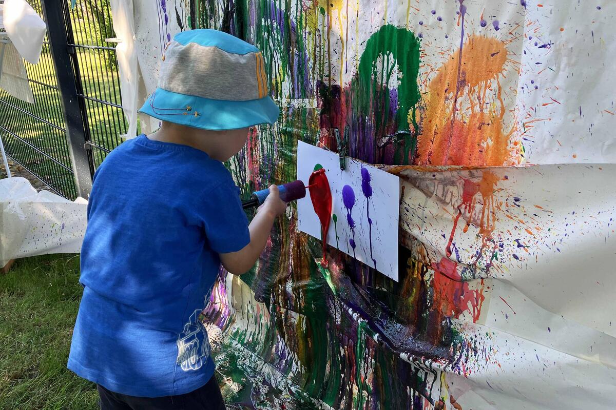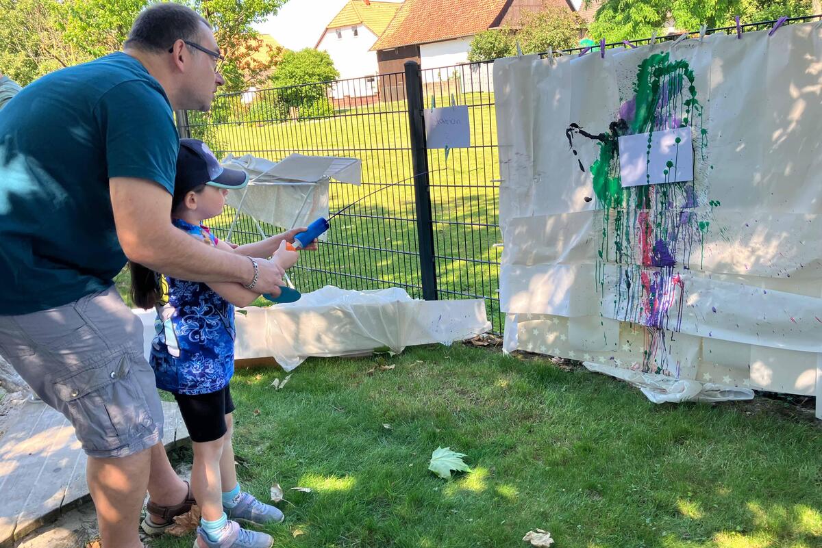 Es konnten Farbbilder mit Spritzpistolen erstellt werden, eine Leinwand wurde mit handabdrücken verschönert, bei einem Kipplasterrennen traten Eltern gegen ihre Kinder an und als Team konnten sie einen Eltern-Kind-Parcours bewältigen. Zur Stärkung gab es für alle ein tolles Buffet, das die Eltern gestiftet hatten und leckere Würstchen vom Grill.