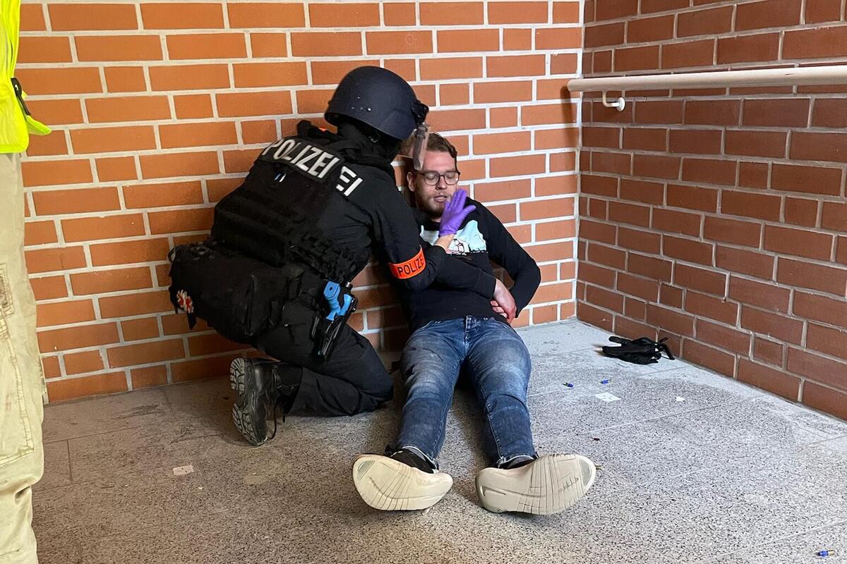 Hämmern, das Zischen von Schweißgeräten, das Kreischen von Sägen - Geräusche, die typisch sind für eine Baustelle. Doch plötzlich eher untypische Geräusche: Schüsse! Ein Mann feuert mit einer Pistole auf mehrere Menschen. Ehemalige Kollegen, wie sich später herausstellt. Es gibt Verletzte, die Lage ist unübersichtlich und gefährlich. Um auf solche Fälle vorbereitet zu sein, hat gestern die Klasse 08/23 der Notfallsanitäterschule Weser-Ems zusammen mit Beamtinnen und Beamten der Bereitschaftpolizei Oldenburg eine solche Lage geübt.