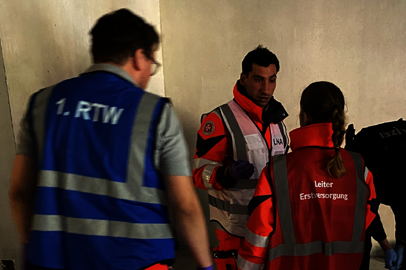 „Einsatzstelle sicher, Rettungsdienst kann vorrücken“, klang es über die Funkgeräte. Die Polizei hatte im Gebäude bereits eine Patientenablage eingerichtet und begonnen eine Sichtung durchzuführen. Diese führte der Rettungsdienst fort und verteilte die Patienten auf die Rettungsmittel. Insgesamt war die Klasse mit zwölf NFS-Auszubildenden, die auf sechs Rettungsmittel aufgeteilt waren, an der Einsatzstelle. Ab dem Eintreffen des Rettungsdienstes wurden die medizinischen Maßnahmen der Auszubildenden von den Beobachtern der Johanniter-Akademie begutachtet. Insgesamt zähltender Rettungsdienst und die Polizei elf verletzte Personen, die in einer engen Zusammenarbeit versorgt werden mussten.