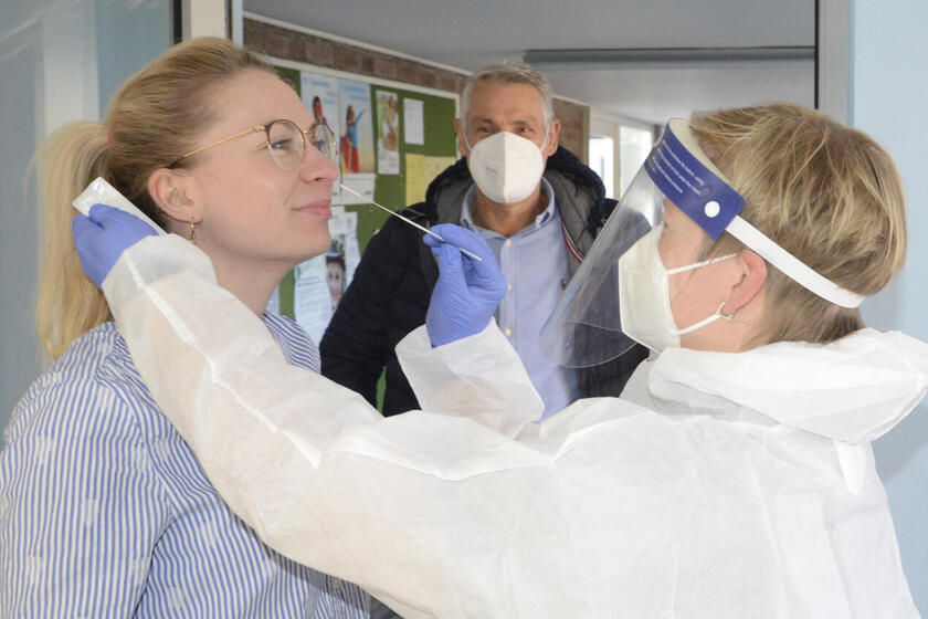 Das erste Team bestand aus Testerin Marita Lueken, dem Bundesfreiwilligendienstler Nico Henke und Jacqueline Rick, die sich um die Anmeldung kümmerte. Insgesamt betreiben die Johanniter im Landkreis Oldenburg bereits vier Teststationen  (neben Ahlhorn sind dies Großenkneten, Wardenburg und Dötlingen) und testen zudem mit einem mobilen Team das Personal in den Kitas sowie das nichtpädagogische Personal in den Schulen.