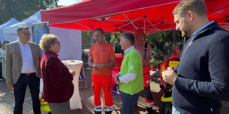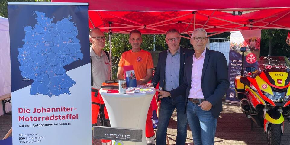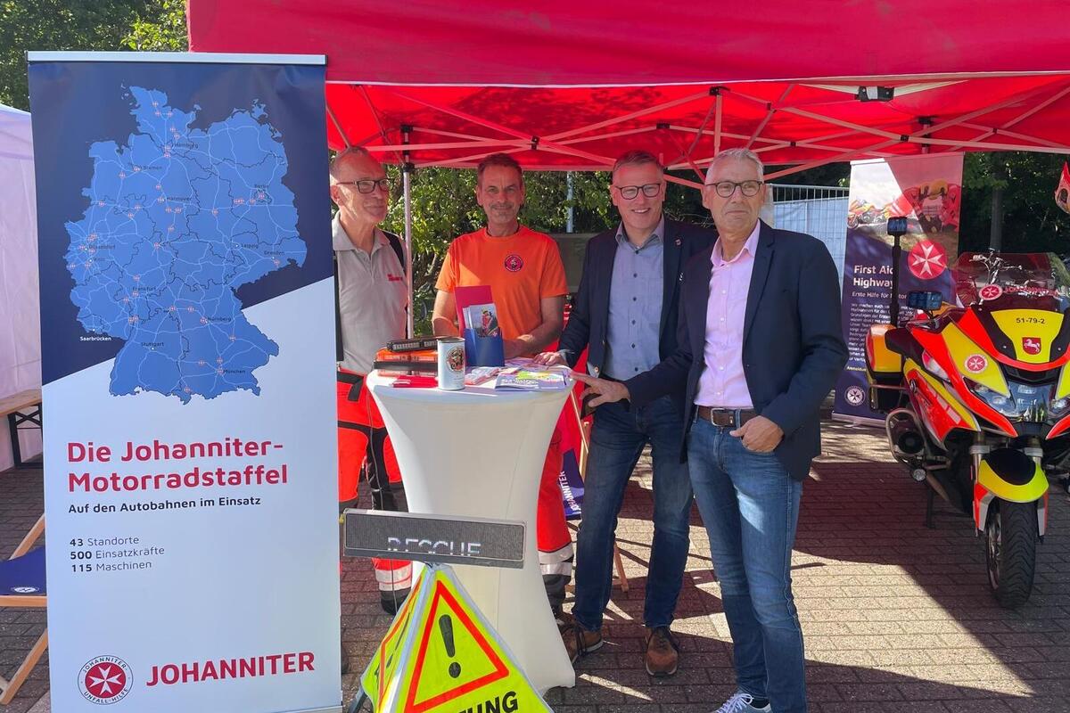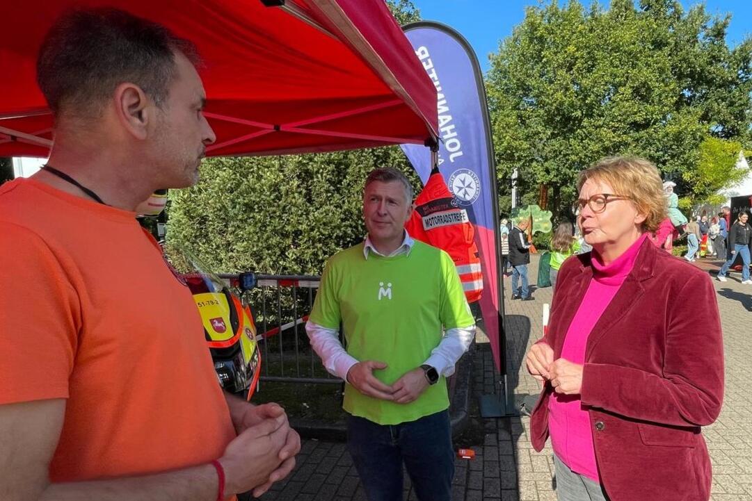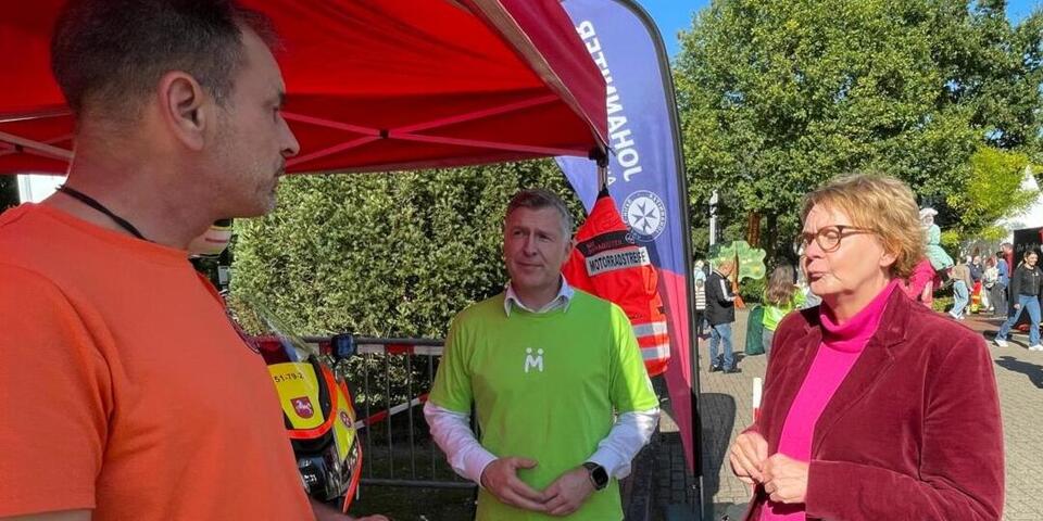 Auch prominente Gäste zeigten großes Interesse an der Arbeit der Staffel. So besuchten neben Landrat Dr. Christian Pundt auch der Huder Bürgermeister Jörg Skatulla und sein Amtskollege Thorsten Schmidtke aus Großenkneten den Stand. Ein besonderer Höhepunkt war der Besuch der niedersächsischen Innenministerin Daniela Behrens, die sich vor Ort ein Bild vom Engagement der Ehrenamtlichen machte. Ministerin Behrens bedauerte, dass sie an den Feierlichkeiten zum 25-jährigen Jubiläum der Motoradstaffel am 05. September nicht persönlich anwesend sein konnte, freute sich aber sehr darüber, beim „FESTzusammen“ nun einigen Ehrenamtlichen der Ahlhorner Motoradstaffel persönlich gratulieren zu können. Zur Jubiläumsfeier hatte sie aus terminlichen Gründen ihren Landespolizeidirektor Bernd Gründel entsandt. Behrens kennt die Johanniter-Motorradstaffel gut. Traditionell eröffnet sie jedes Jahr im Frühjahr die Saison der Johanniter-Staffel in Niedersachsen.